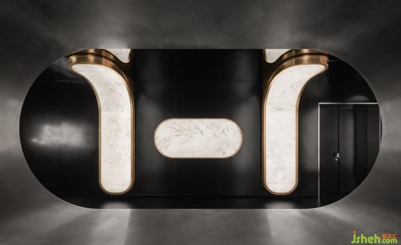 界面裝飾具有舞臺布景般的平衡構(gòu)圖,序列對稱的曲面燈光裝置組合,提煉源自新天地石庫門的深而長的弄堂形態(tài),線性的節(jié)奏韻律指引行進體驗向內(nèi)延伸。