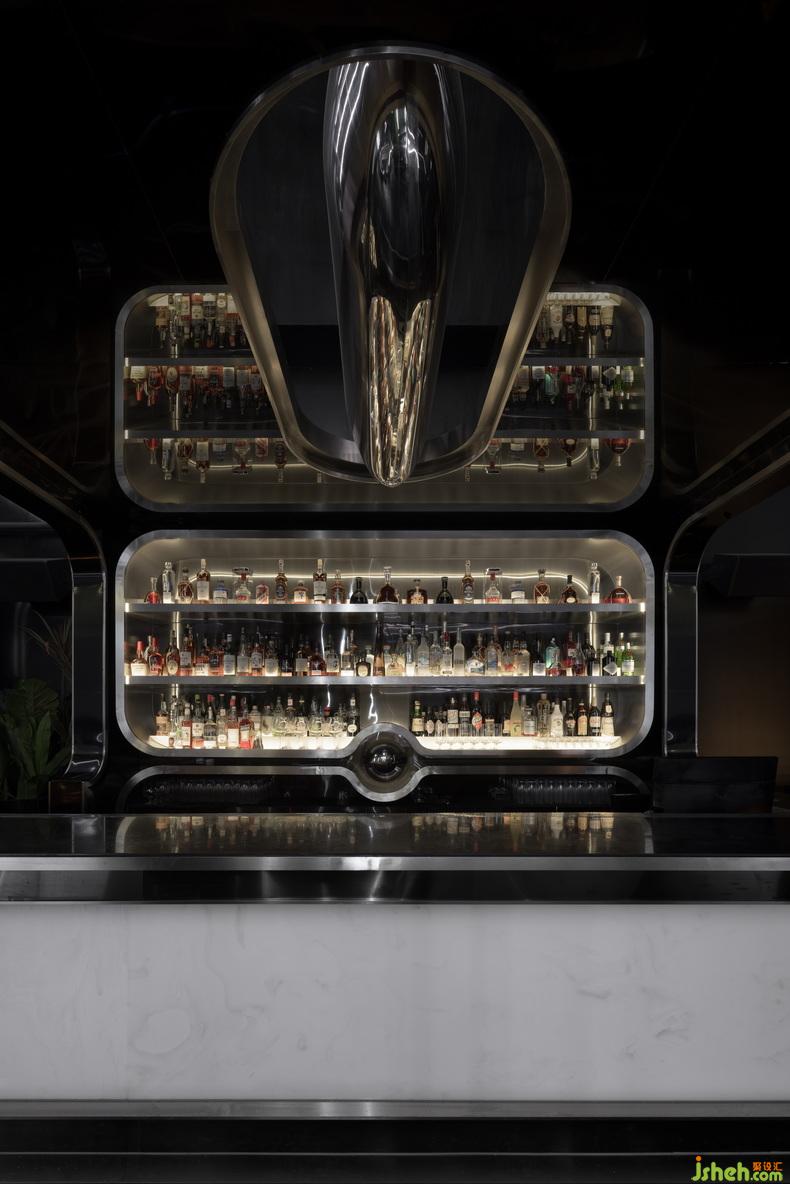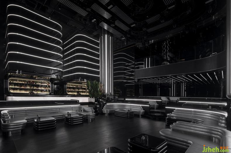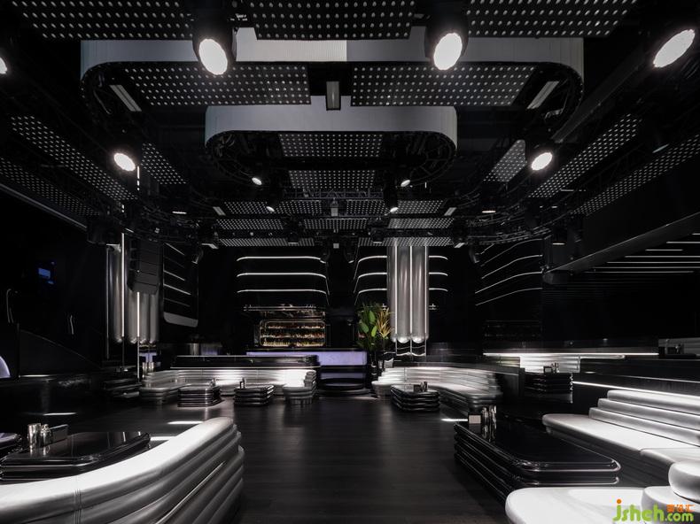 石材、鏡面、烤漆、不銹鋼、皮質(zhì)等材料組合為鮮明的視覺傳達,主色中卻有有著近百種不同層次的“黑”。夜店設(shè)計形態(tài)簡潔而抽象的有機曲線,亦打破橫平豎直的構(gòu)圖并重新釋義經(jīng)典美學。