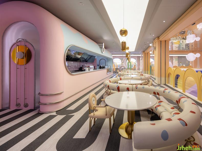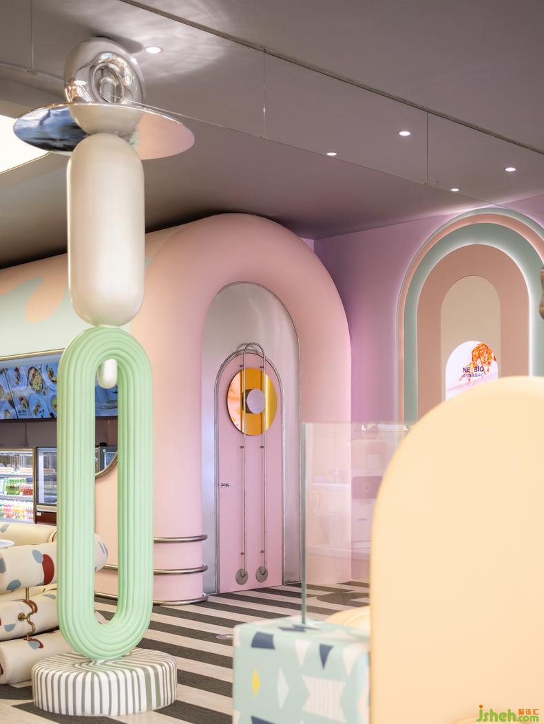 主體空間呈現(xiàn)雙層結(jié)構(gòu),室內(nèi)設(shè)計(jì)師容納豐富的縱深場(chǎng)景和內(nèi)部陳設(shè)密度,“后山”則是貫穿始終的母題。彩虹、太陽(yáng)、云朵、月亮,圍繞中軸的山神柱展開(kāi)布景,將斑斕熾烈的簡(jiǎn)筆涂鴉化作具象輪廓的真實(shí)體驗(yàn),喚醒記憶神經(jīng)中的空間好感。大自然的調(diào)色盤賦予空間全尺度光譜,眾多視覺(jué)要素統(tǒng)一為生動(dòng)的全景。尤似馬蒂斯的理想,“用色彩在畫(huà)面上奏出音樂(lè)”。