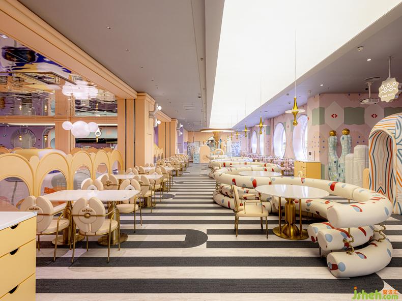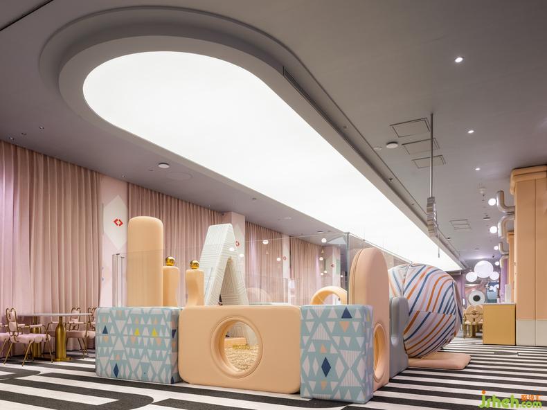 自由動(dòng)線串聯(lián)的空間序列中,多維度視角的關(guān)注點(diǎn)落在個(gè)體的人。兒童樂園設(shè)計(jì)記憶的灰度注入低飽和、弱對(duì)比的用色方案,吸納自然的溫暖肌理。照明亦多以白色燈膜貼近自然光的方式營(yíng)造大面積漫反射的舒適光環(huán)境。