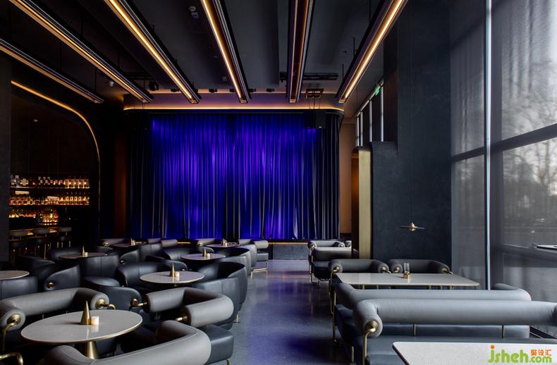 酒吧設計按鈕移開電動門進入酒吧主體,臥于吊頂上的金屬軌道燈,引導視線.一幕深邃的藍色幕布如果凍般凝固在舞臺上.