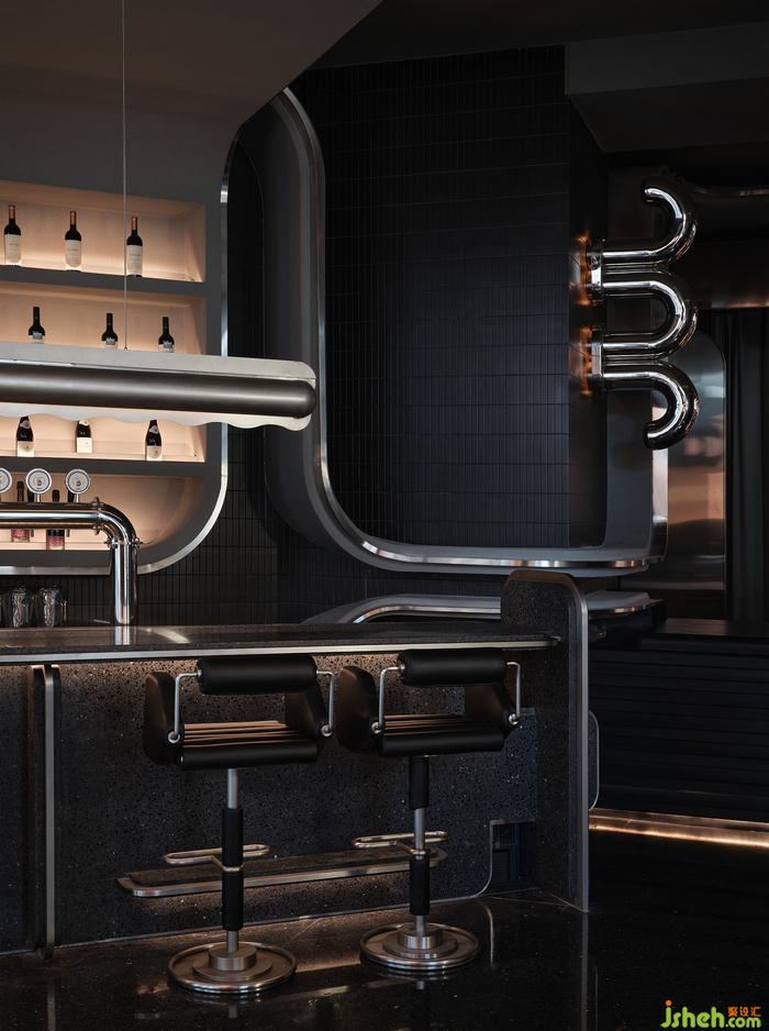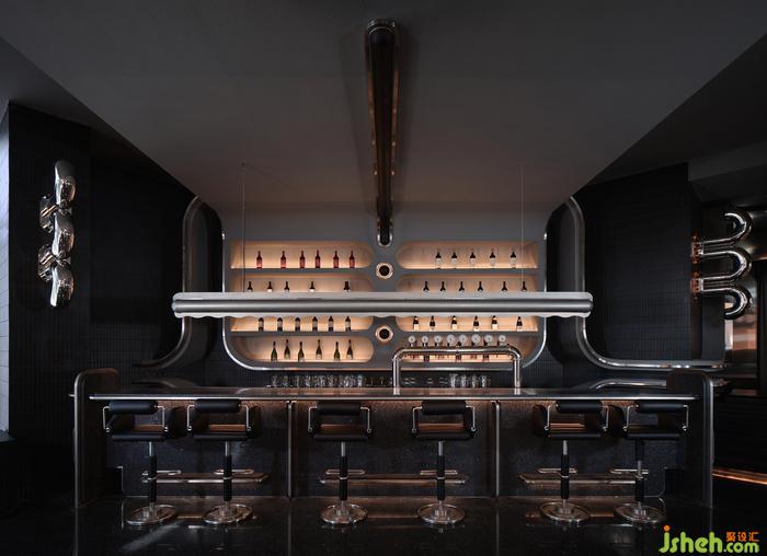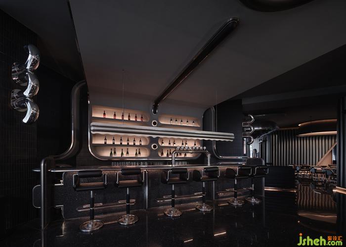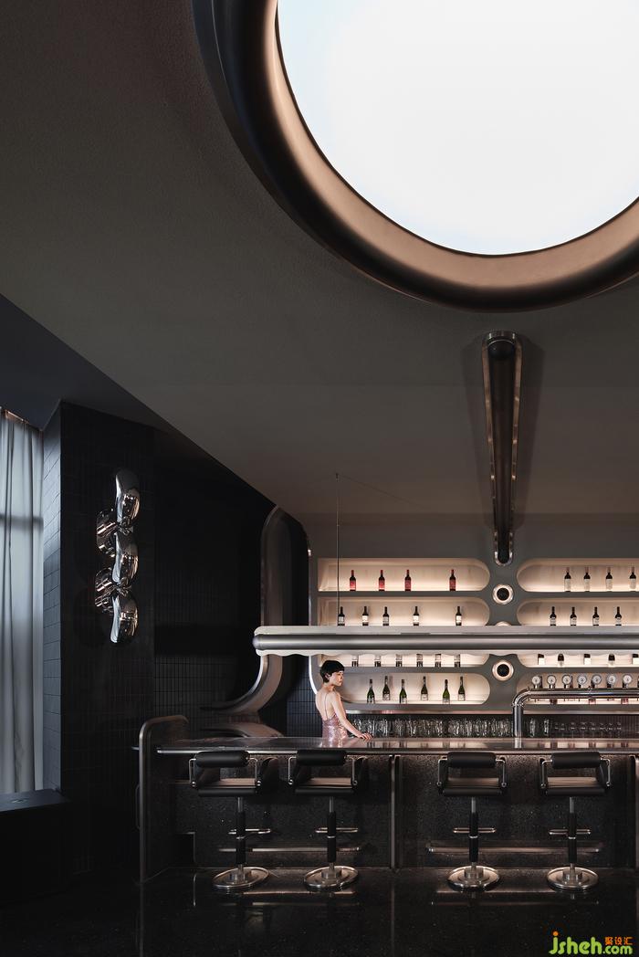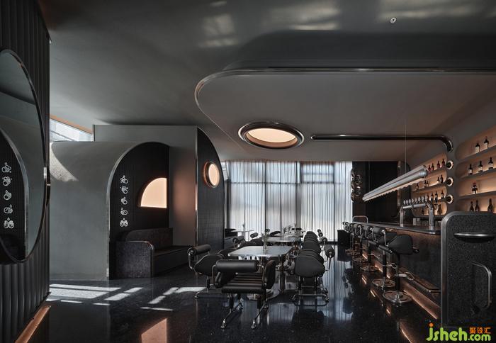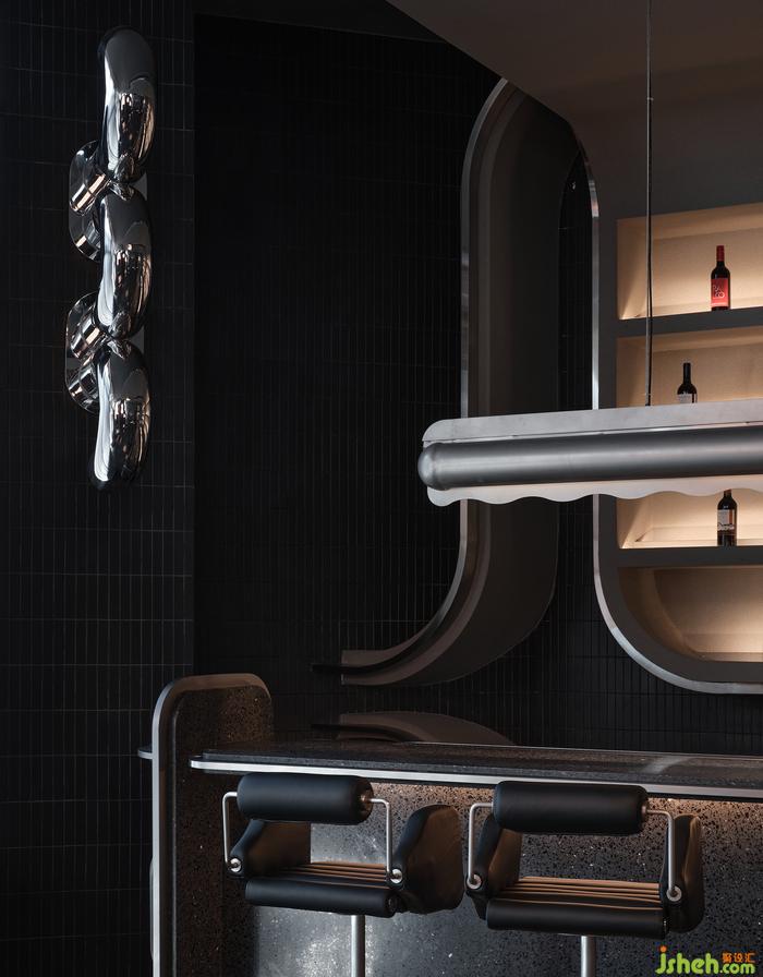 空間中的石材、金屬、皮質(zhì)、海綿、音樂、幕布,經(jīng)由設(shè)計在不改變物質(zhì)形態(tài)的基礎(chǔ)上,餐廳設(shè)計重新組合其線、面、體積、重量、紋理,而形成被鉆石般精密計算、切割打磨、晶瑩無暇的一個整體場景。幾何與有機構(gòu)圖交相疊映,不同光澤度中和色系上的沉悶,恰到好處地劃落視覺重點。