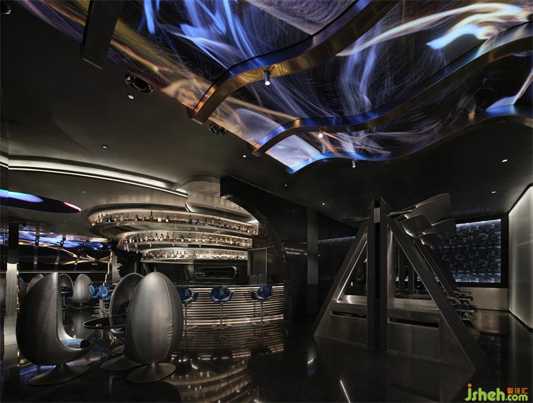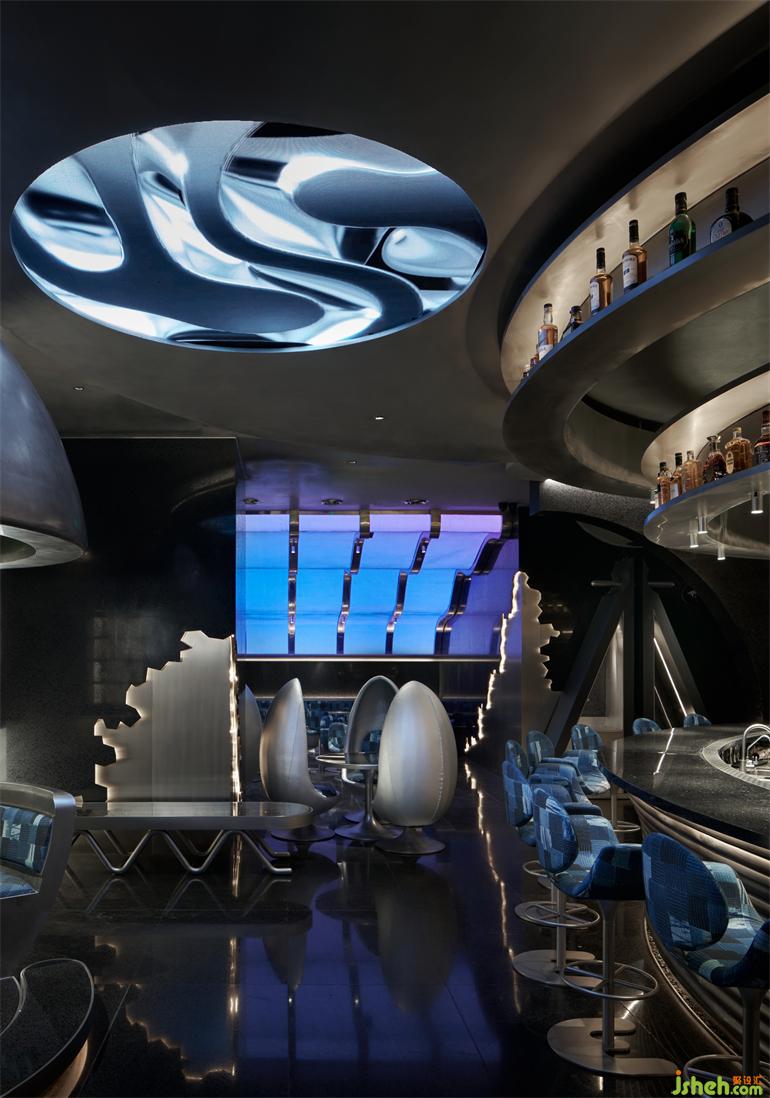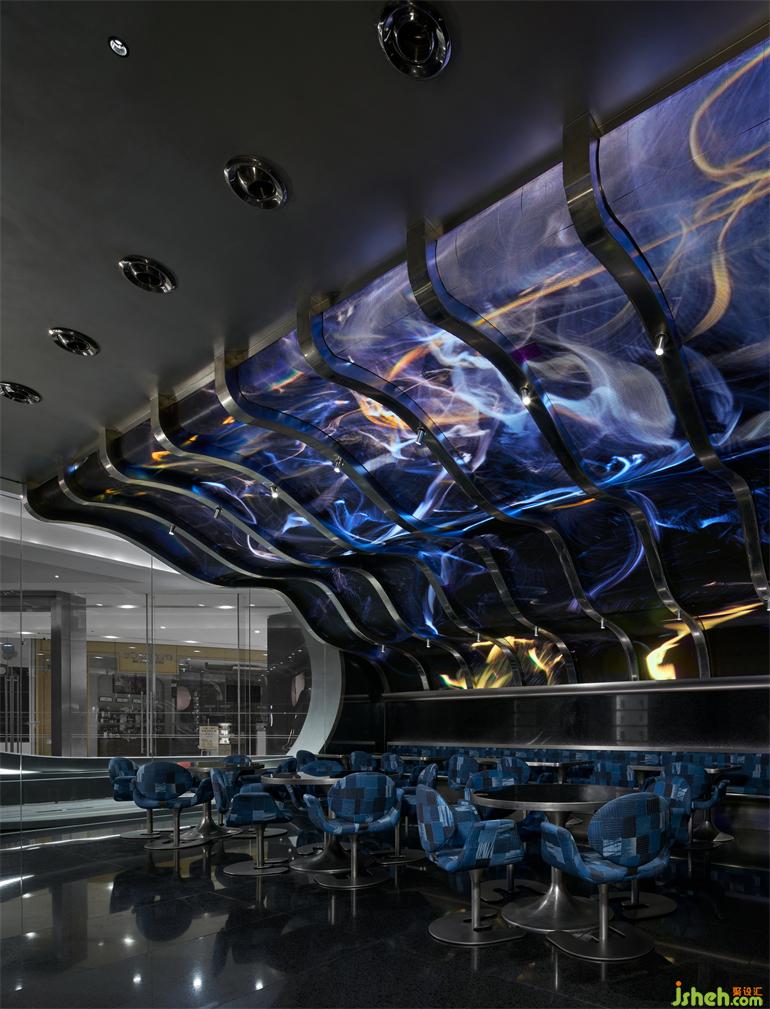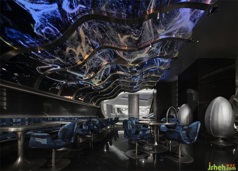 出于降低成本和環(huán)保的考慮,成都居酒屋設(shè)計師選擇以小塊的方形LED屏幕取代原計劃大面積的曲面LED屏幕,化整為零地拼合出曲面的效果,雖然留有一些細微的拼接縫隙,但在多媒體藝術(shù)家“電子煙火”的屏幕視覺加持下,這個缺陷終被完美地消解,在成本、功能與美學(xué)之間實現(xiàn)最優(yōu)解。