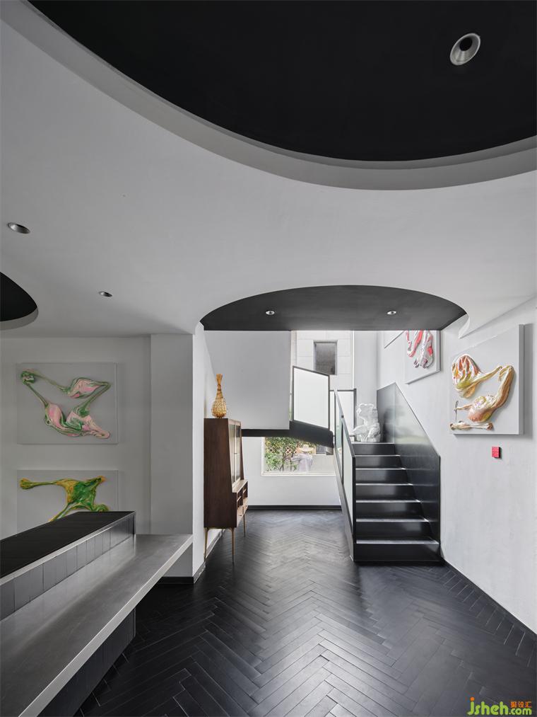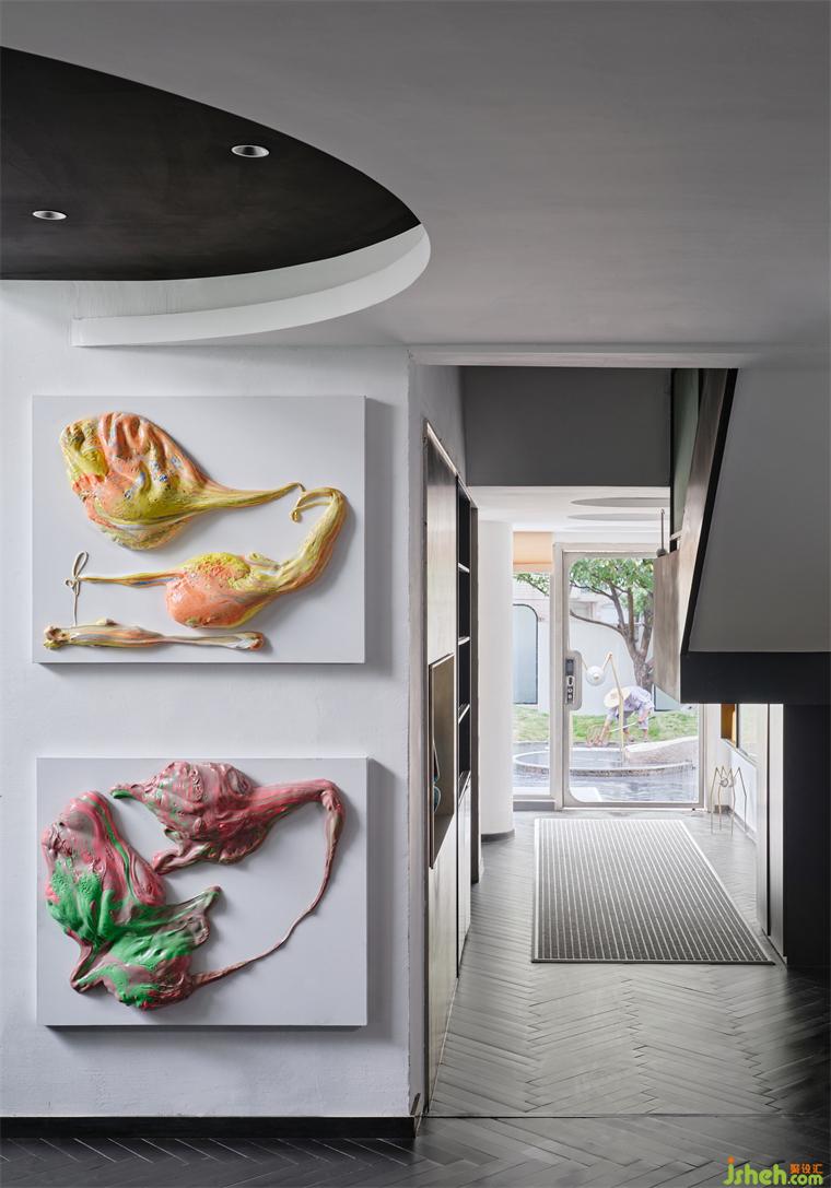室內(nèi)的原結(jié)構(gòu)老化,隔間多、通道復雜,導致整體坪效的浪費。但不同于常規(guī)解決方案的“開放式”拆改,設計基于對零亂體塊的梳理歸納,將重心轉(zhuǎn)移到畫廊式的展陳視角,辦公室設計通過“賞畫”壓縮空間建筑的深度,辦公室設計消解隔墻的體量感,賦予條件不盡理想的空間基礎以新的闡釋。