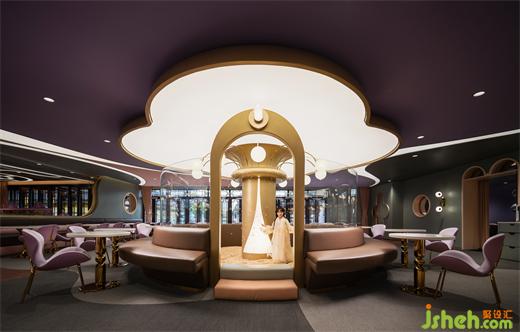 餐廳區(qū)延續(xù)生動氣象的飄逸筆觸,游離發(fā)散而又回旋統(tǒng)一,兒童樂園設(shè)計無時間印記的可塑材料結(jié)合流線型的座椅單元,枝型燈具以豫園燈會作為文化意義的投射。時間、色彩、線條以復合的存在形式,不斷遞進異時空故事的交錯感。