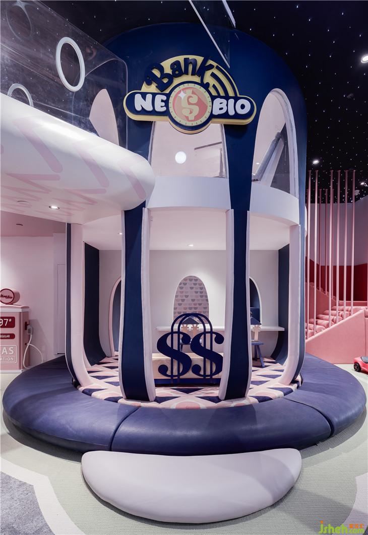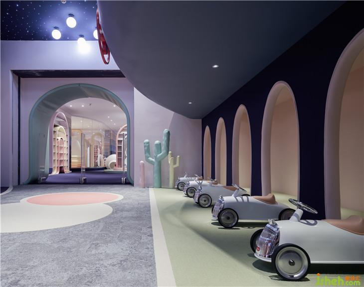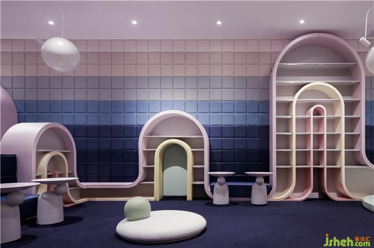 第二區(qū)域:圖書區(qū)--借用彩虹與云朵的關系表達雨過天晴后的絢麗景象,并用抽象后的構(gòu)圖完成書架功能以及孩子樂于實踐的爬高與鉆洞的娛樂功能。