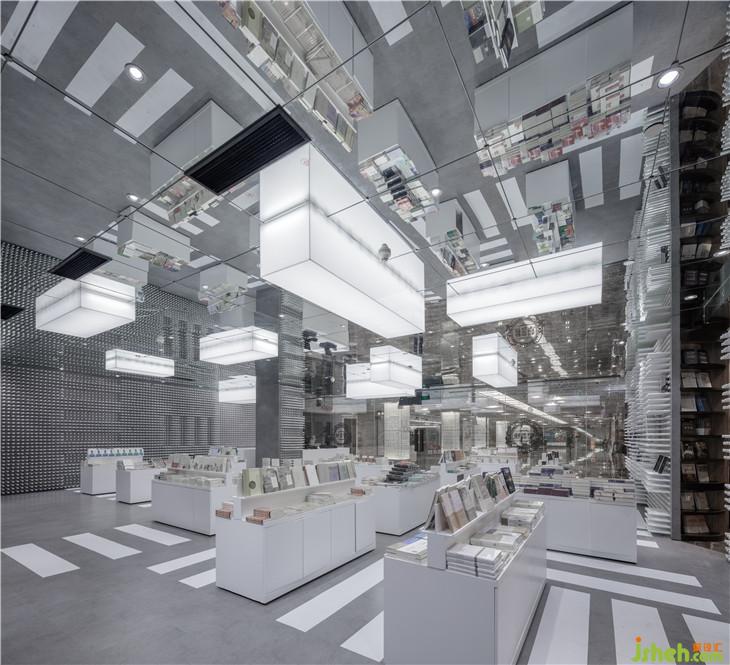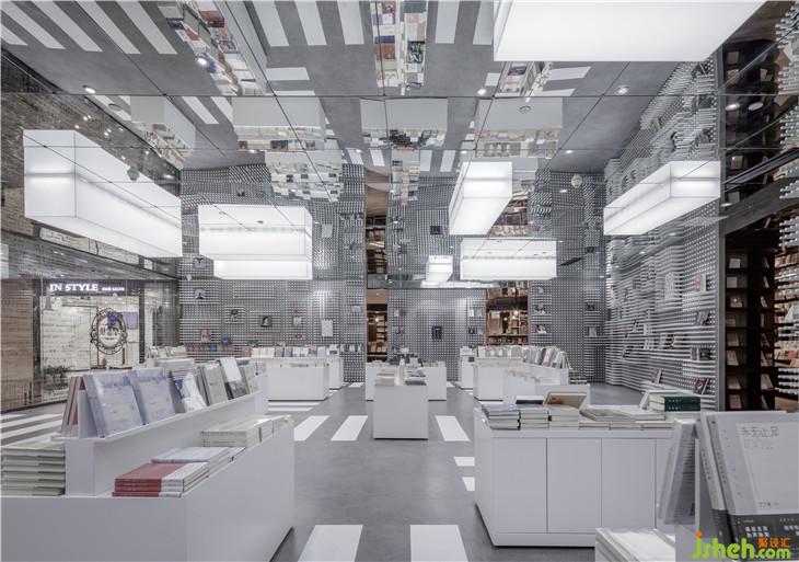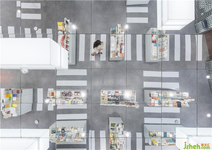 乘坐電梯來(lái)到四樓并向深處看去,可能就會(huì)看到鐘書閣的字幕玻璃幕墻,隱約可見(jiàn)其中干凈整潔灰白色調(diào)和諧暈染,安靜的光暈透過(guò)字幕幕墻的空隙傳遞出來(lái)。走近,走進(jìn)。你便知道這次鐘書閣要講的與書的故事與斑馬線有關(guān)。這正是這家鐘書閣要表達(dá)的情懷,也是上海這座繁忙的城市的縮影。素色的混凝土映射著著城市的馬路顏色,白色擺書臺(tái)橫豎有致靜立路面,鏈接每個(gè)書臺(tái)的地面畫著一條條白色的人行橫道線條,明確指引著書臺(tái)與書臺(tái)間的路徑。滿墻陣列的白色的圓管每一根都可以自由伸縮進(jìn)墻體,通過(guò)這樣的機(jī)動(dòng)性可以塑造不同樣式的陣列圖形,這種變換的形式亦是擺放書的架臺(tái)亦同時(shí)更映射了快速變換的社會(huì)現(xiàn)狀。在這里讀者儼然進(jìn)入到了一個(gè)城市空間,但是這里沒(méi)有車水馬龍,只有安安靜靜的路與斑馬線,還有在書臺(tái)上落成山的書。因?yàn)榘唏R線好比那一本本伴隨我們成長(zhǎng)的書籍。在對(duì)的時(shí)間,遇到對(duì)的指引。由此來(lái)表達(dá)書與讀者的精神關(guān)聯(lián)。室內(nèi)設(shè)計(jì)師