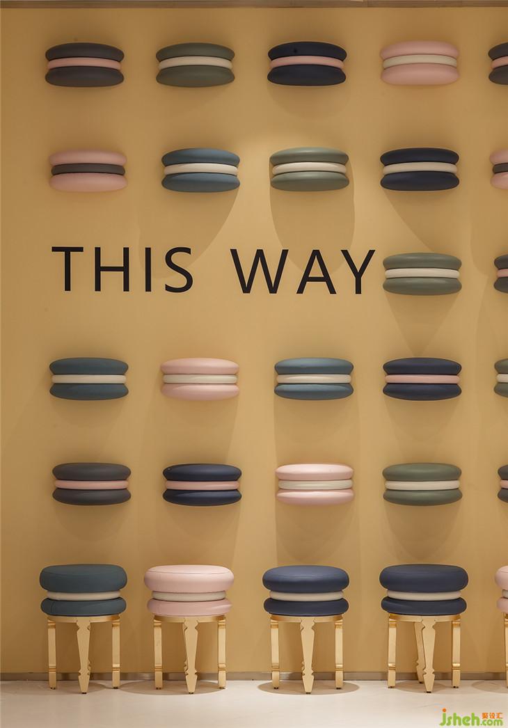 二層的餐飲層作為辦公層的服務(wù)空間,我們把大部分的空間留給了商戶,把設(shè)計點(diǎn)主要放在了走廊的端頭墻面,利用彩色的背景墻面和一些餐飲相關(guān)的趣味家具和裝置在視覺上吸引人們的眼球,同時起到和人們互動的作用。這些家具除了視覺上的吸引,同時也是餐飲層的共享桌椅和休息空間。