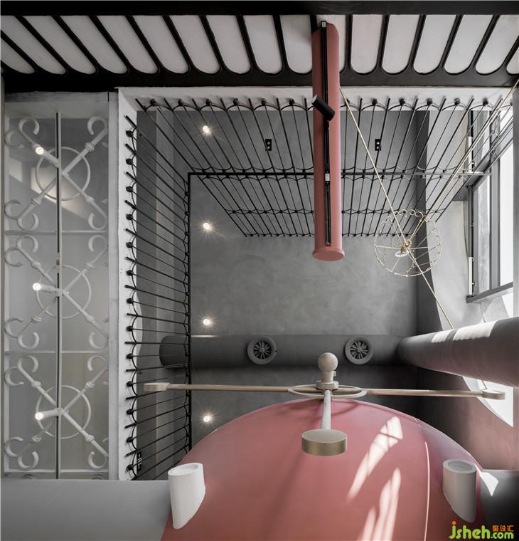 我們把原本是兩層的空間的樓板全部拆除,變成一個(gè)搞達(dá)8、9米的通高空間,在地面用極簡(jiǎn)的手法來(lái)還原,這些“反應(yīng)罐”中會(huì)設(shè)置新零售的體驗(yàn)設(shè)備。消費(fèi)者可以在不同的罐當(dāng)中感知不同的設(shè)備帶來(lái)的新商業(yè)的消費(fèi)體驗(yàn)感。并在4-5米高的空間中重新搭建樓板,交錯(cuò)穿插在我們還原的“反應(yīng)罐”當(dāng)中作為二樓共享研發(fā)人員辦公的工作與交通平臺(tái),這樣,工作人員在空中的平臺(tái)上工作,消費(fèi)者在樓下體驗(yàn)空間里新科技與信息化帶來(lái)的商業(yè)體驗(yàn),通高空間的視線聯(lián)動(dòng)也使得他們可以互相感知到彼此的存在,讓空間變得更加有趣。整個(gè)空間借由工廠構(gòu)圖來(lái)搭建的背景下更利用“能量傳送管”的構(gòu)圖來(lái)隱藏全部電線與空調(diào)的設(shè)備線路,使得空間暴露出來(lái)的工業(yè)化設(shè)計(jì)都被精致的修飾藝術(shù)簡(jiǎn)化,原本應(yīng)該存在空間的工程管線被完美的隱藏在后創(chuàng)作的“能量疏通管”當(dāng)中。更在部分空間使管道聯(lián)動(dòng)到地面上,結(jié)合造型創(chuàng)造了一系列的休息桌椅,使空間看起空間層次豐富但是亦被精致的規(guī)劃為不同視角的構(gòu)圖感。