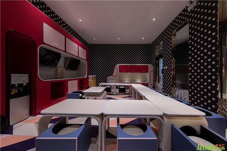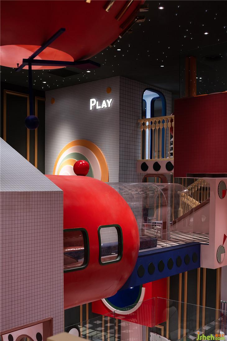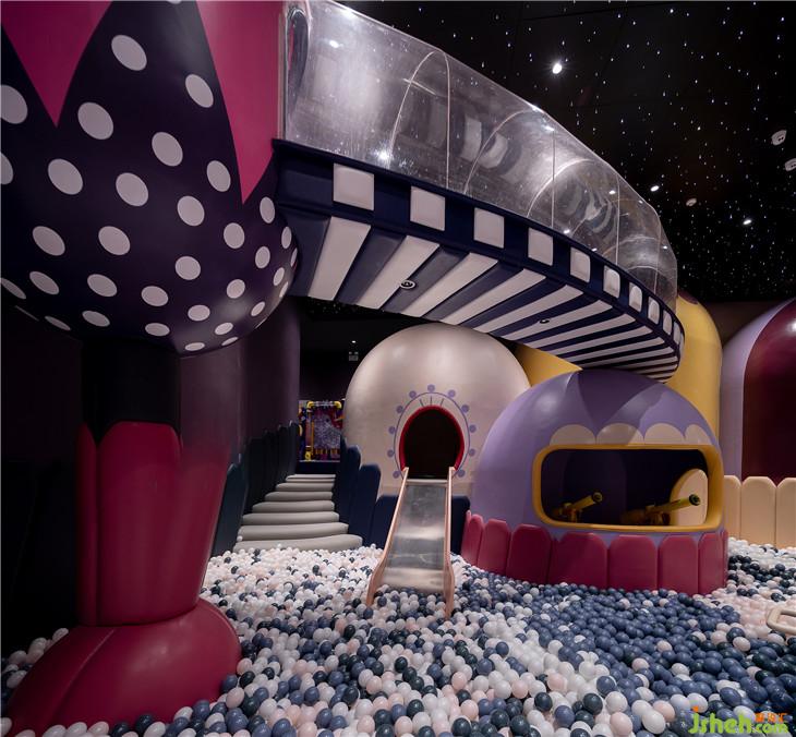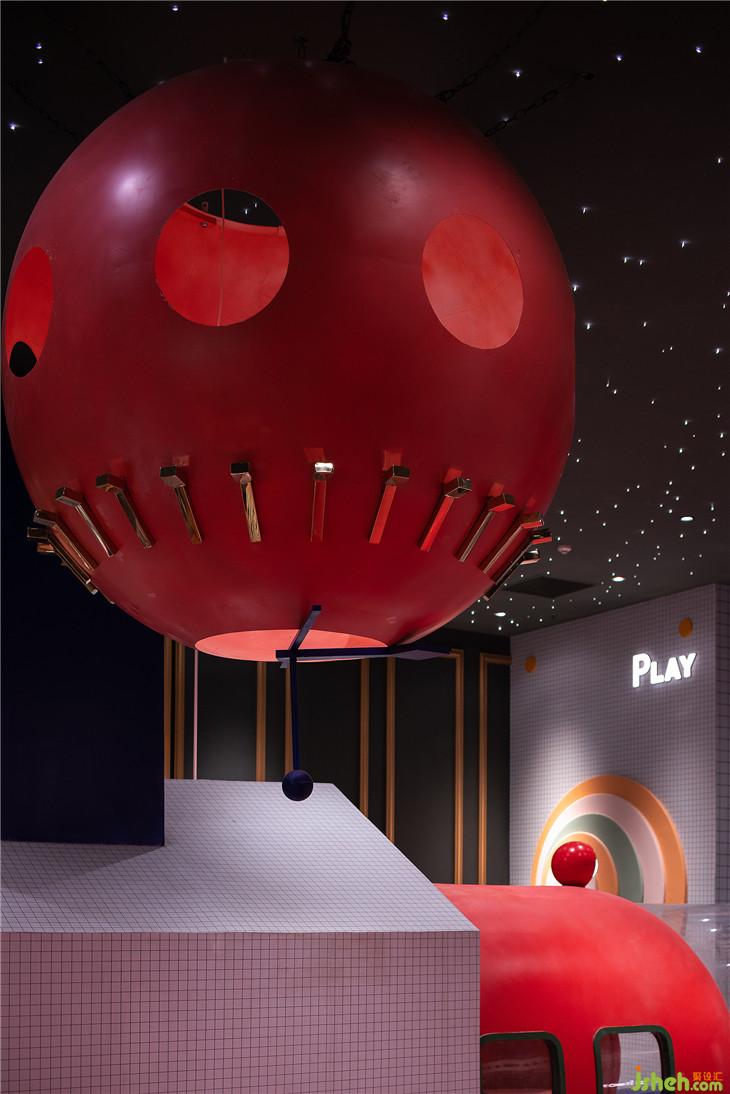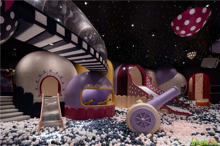 球池區(qū)位于平面空間上的西南角,像是MELAND城市邊緣一塊未經(jīng)開發(fā)的密林。由青蛙和蝸牛藝化而成的大型裝置,包裹住娛樂設(shè)施的同時(shí)也串聯(lián)起了爬道和滑梯。奇幻紫調(diào)與夸張波點(diǎn)的活潑搭配,刺激著小朋友解放愛玩鬧的天性。與傳統(tǒng)的室內(nèi)攀爬不同,在MELAND的攀爬區(qū),白色的背景墻配以紅色的支點(diǎn),與延伸到地面的紅色波點(diǎn),共同堆砌出了這個(gè)空間時(shí)尚而怪誕的藝術(shù)質(zhì)感。