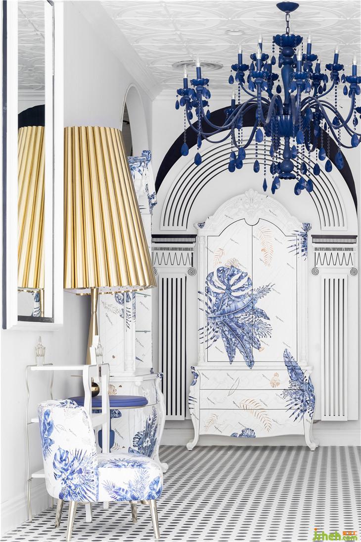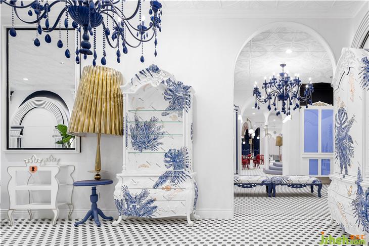 純凈高雅的白色勾勒出了空間明亮輕快的主色基調(diào),設(shè)計師將精美的花卉圖樣巧妙地表現(xiàn)在了家具軟包與柜體等不同介質(zhì)上,雖工藝復(fù)雜,卻使得統(tǒng)一的花紋像潑墨般恣意游走在純白畫布上,使空間不僅有了靈動的色彩,又引申出了一條明確的追隨主線?;y用青花藍(lán)重塑了綠植圖案,烘托出了空間生機(jī)盎然的溫馨氣質(zhì)。而其余大色塊的運(yùn)用,則填充了歌劇質(zhì)感的濃郁撞色背景,結(jié)合拱形帷幔打造的舞臺場景感,隱喻了項目業(yè)主的職業(yè)特性。歐式門拱與中式剪紙的形式呼應(yīng),歌劇質(zhì)感撞色與雅致青花藍(lán)的色彩襯映,刻意濃郁的色彩比臨與隨性撒墨的手法對沖,中西方美學(xué)韻味在此相遇,迸發(fā)出縈滿審美意趣的奇妙對話。