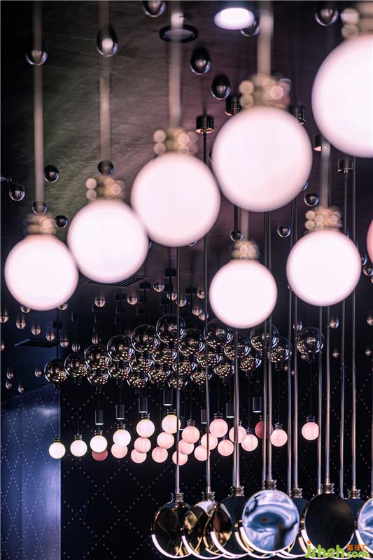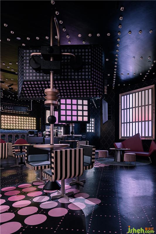 攝影燈上不同幾何形態(tài)的暖色調(diào)燈光不僅帶給觀眾極強(qiáng)的暗示,更是設(shè)計(jì)師的巧妙構(gòu)思:燈光經(jīng)過反射作用后與地面漸變交錯(cuò),在延伸的網(wǎng)格立面中明暗過渡形成流暢動(dòng)線,整體的抽象藝術(shù)風(fēng)格凝練出了創(chuàng)意與活力交匯的精湛美感。電影院設(shè)計(jì)