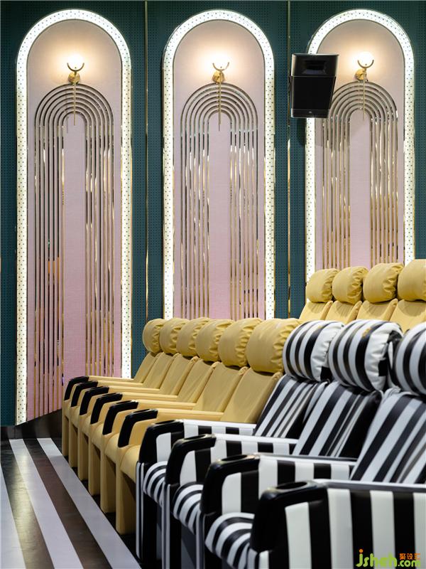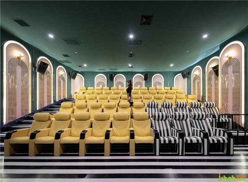 輕奢優(yōu)雅的三號(hào)影廳采用了古典建筑元素拱門,帶來規(guī)整的秩序感,黑白條地毯和座椅點(diǎn)綴寧?kù)o的深綠空間,流動(dòng)的視覺感受低調(diào)地烘托著影像故事。