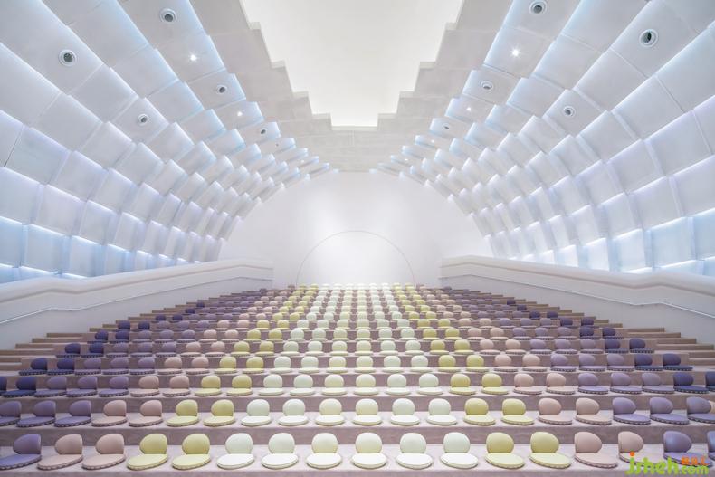 童話的質(zhì)感與色彩在禮堂內(nèi)愈加濃郁,球形的吊頂與白色的背景烘托了禮堂莊重圣潔的質(zhì)感,點(diǎn)亮場(chǎng)內(nèi)的背景燈,漸變色的座椅與燈光暈染出動(dòng)人的霞光,讓整個(gè)空間顯得靈動(dòng)柔美。孩子們仿佛在綻放的花蕊中,像一只只靈巧漂亮的小蝴蝶。
