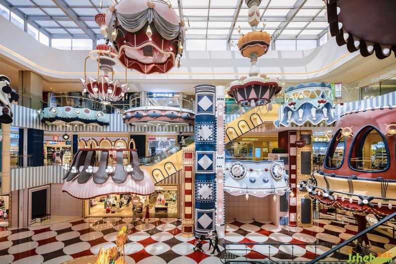 設(shè)計師突破傳統(tǒng)裝飾美學(xué),賦予書本、臺燈、鳳尾夾、主題公區(qū)設(shè)計尺子等文具恢弘的建筑尺度,營造兒童區(qū)獨特的沉浸式體驗效果。巨型構(gòu)造與日常用品的奇異尺度反差,不僅更好地統(tǒng)籌了公區(qū)內(nèi)攔河裝飾、燈具、店鋪立面、導(dǎo)向標(biāo)識等,且場景的交錯讓童話氛圍能夠迅速傳達(dá)到人群,準(zhǔn)確捕捉主力消費(fèi)者的注意力。