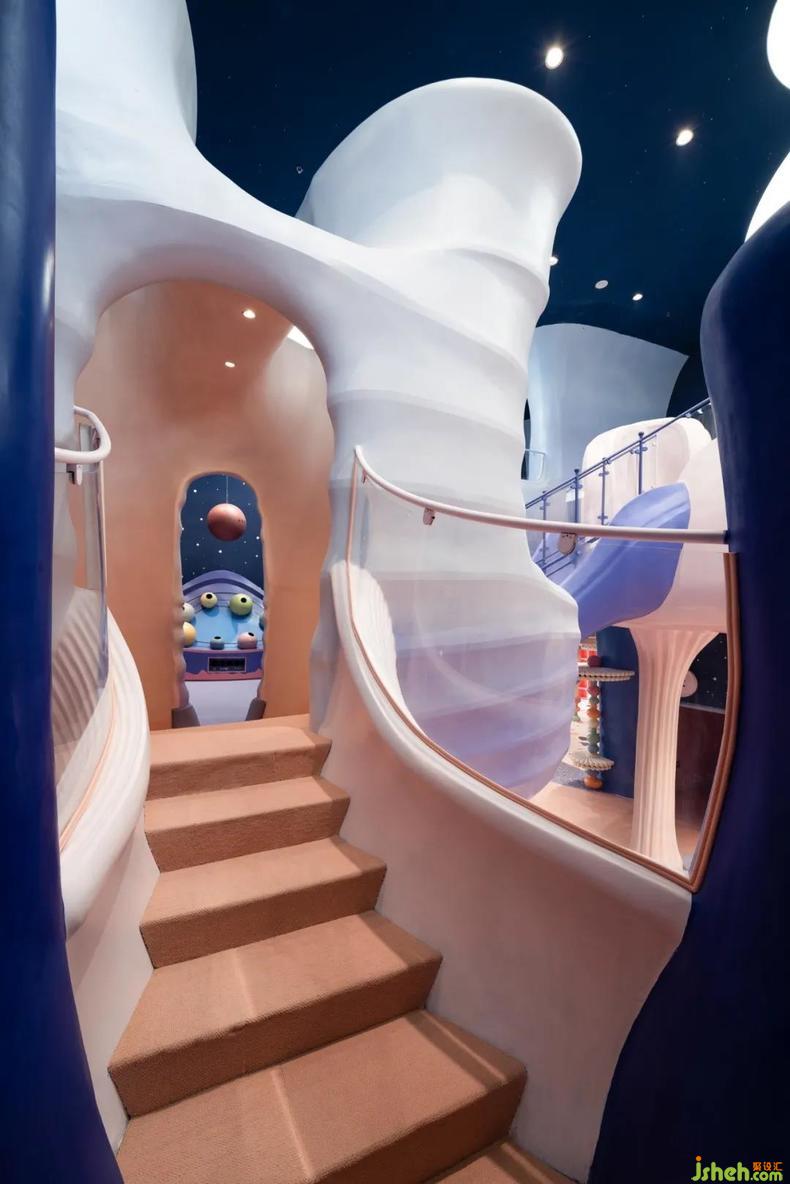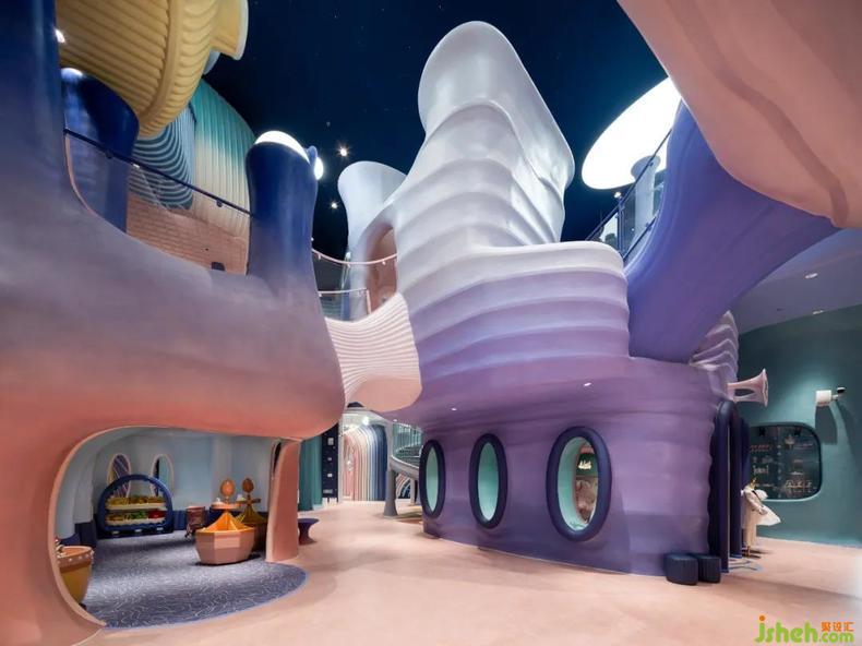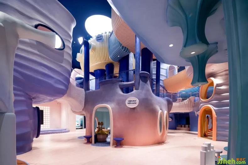 樂(lè)園設(shè)計(jì)抽象出珊瑚的形態(tài),再重構(gòu)為一座座爛漫的珊瑚房子,彼此連結(jié),簇集為千姿百態(tài)的珊瑚礁樂(lè)園。天花板上的夜空星光安靜灑落,珊瑚悄然呈現(xiàn)著夕陽(yáng)余暉下漸變的多彩。高約十米的模擬城下,設(shè)計(jì)師打造出一場(chǎng)屬于深海的神秘盛會(huì),孩子們沿著流暢的動(dòng)線(xiàn)穿梭于立體層次豐富的模擬城,如一只只漂浮在珊瑚礁中的小魚(yú),探索眼前應(yīng)接不暇的新奇風(fēng)光,體悟海洋作為生命搖籃的偉大。