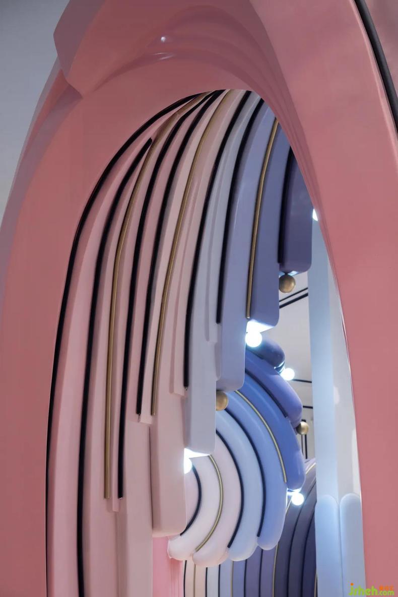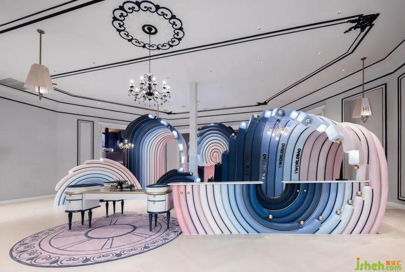 當(dāng)客人步入接待換鞋區(qū),聆聽(tīng)眼前海洋的潮汐奏鳴。設(shè)計(jì)師將功能和美學(xué)統(tǒng)籌為整體,藝術(shù)性地提煉浪花元素演化為鞋柜與服務(wù)臺(tái)。樂(lè)園設(shè)計(jì)形如彩虹的甜美浪花在室內(nèi)翻騰,堆疊出瑰麗的海面,以多功能L形前臺(tái)為中心的單向動(dòng)線(xiàn)串聯(lián)了接待區(qū)和零售區(qū),并激活服務(wù)臺(tái)對(duì)雙區(qū)的服務(wù)屬性。