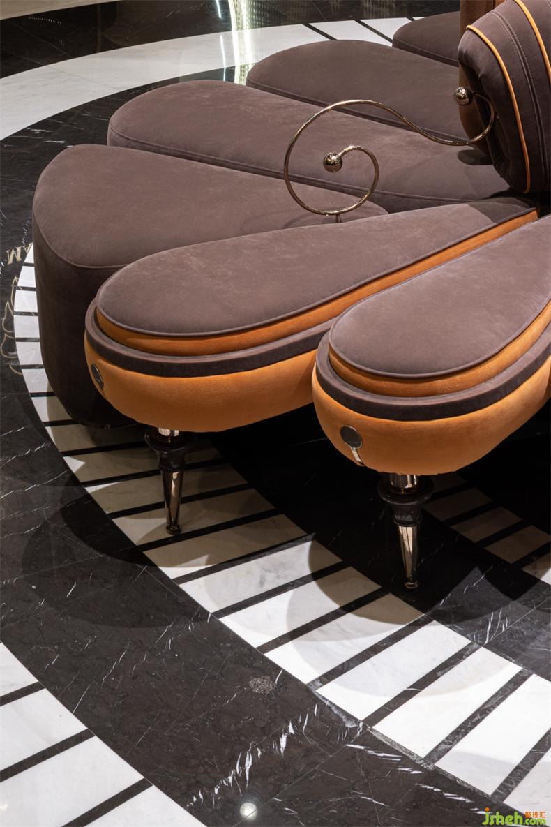 一組大型藝術(shù)沙發(fā)如同一簇盛放的鮮艷的花,從空間中生長(zhǎng)而出。色彩的對(duì)撞,觸感的反差,如一個(gè)耀眼的符號(hào)般象征著凝結(jié)的生命力。
