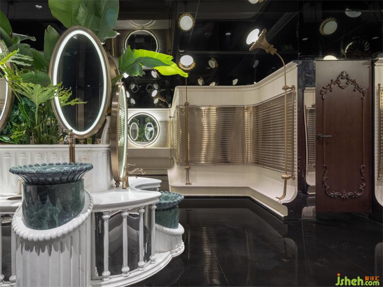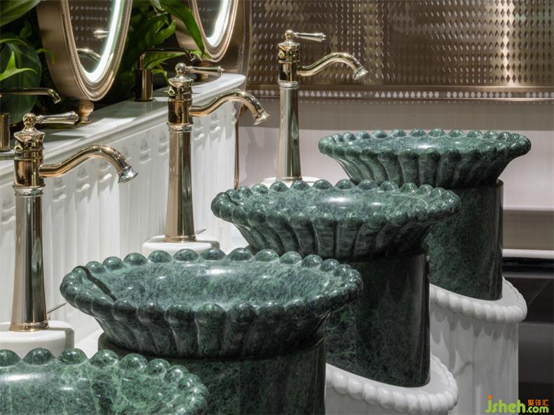 盥洗臺(tái)靈感來(lái)源于花園中的噴泉,巧妙利用高差將功能性妥當(dāng)融入,衛(wèi)生間設(shè)計(jì)綠植與綠色大理石洗手臺(tái)盆既呼應(yīng)了空間故事線,也使其成為室內(nèi)唯一色彩鮮明的視覺(jué)焦點(diǎn)。