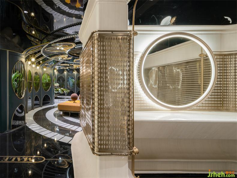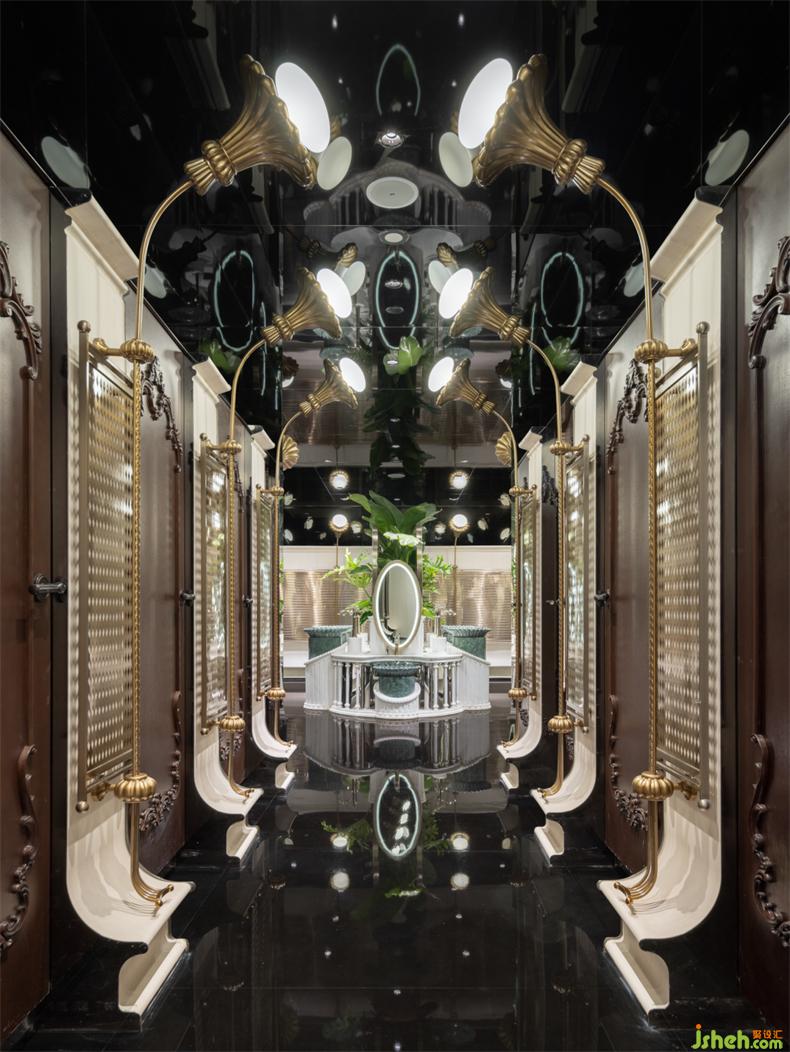 衛(wèi)生間設(shè)計(jì)師繼續(xù)沿用雙層表皮的理念,采用自然木色的木飾面板搭配香檳金色的藝術(shù)格柵,更著重強(qiáng)調(diào)近人尺度的空間內(nèi)的舒適性與便利性,同時(shí)不失藝術(shù)格調(diào)的拿捏與主題美學(xué)的把握。