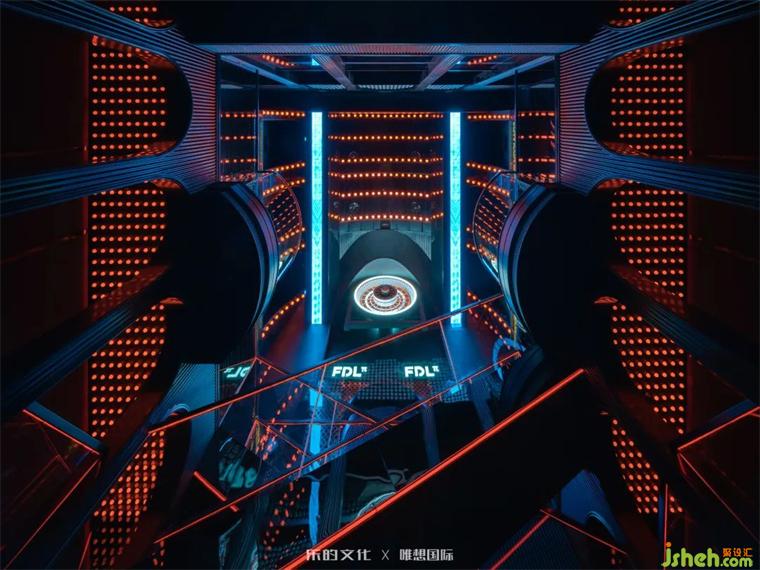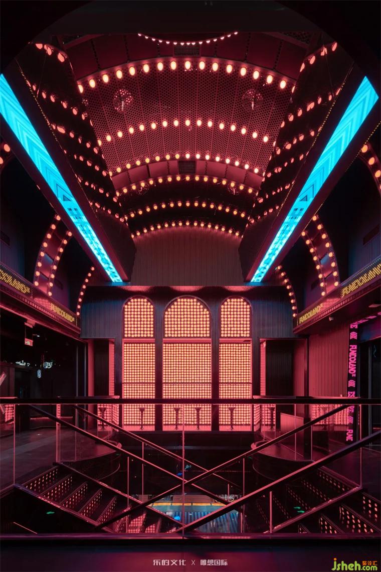 新式KTV入口位于隧道餐酒吧的盡處,裝修設(shè)計師在平面規(guī)劃階段刻意犧牲了二層的部分面積,以打造雙層挑高門廳的震撼視覺效果。雙座樓梯交錯出X字母的造型,設(shè)計師運用符號美學(xué)將空間的魔幻調(diào)性把握得淋漓盡致。裝修設(shè)計暗黑金屬烘托出的神秘氛圍,在紅色線性燈帶和幾何光斑的點綴下,呈現(xiàn)出近乎迷幻的未來美學(xué)。