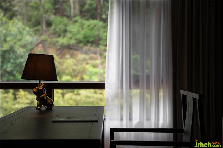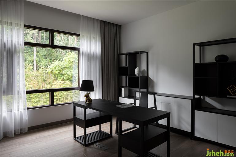 三層的主臥套間舍去厚重的裝飾,給人自然平衡的簡(jiǎn)約感,傳達(dá)了人居生活的最佳狀態(tài)。陽光透過落地玻璃窗給沉穩(wěn)的書房撒上一道美景,每一件單品,每一種材質(zhì)都在同一空間里呼吸著,互相交織,呈現(xiàn)出極簡(jiǎn)設(shè)計(jì)的安靜與美好。主臥臨山而設(shè),書房飄窗,可欣賞室外山水好景。