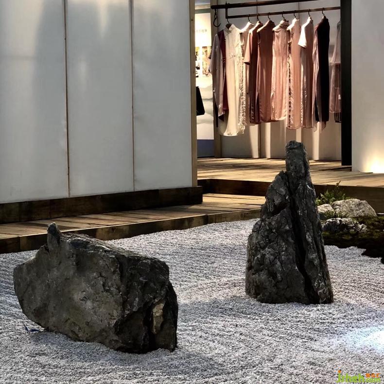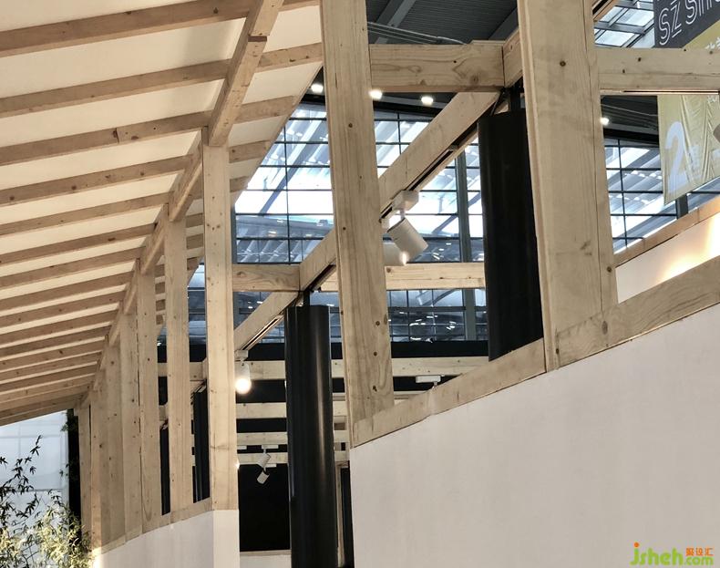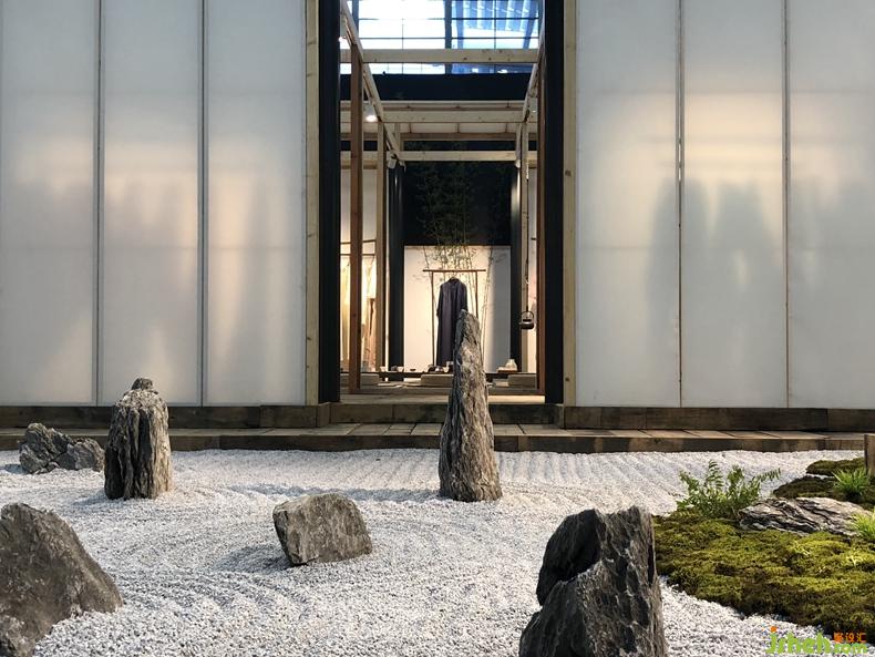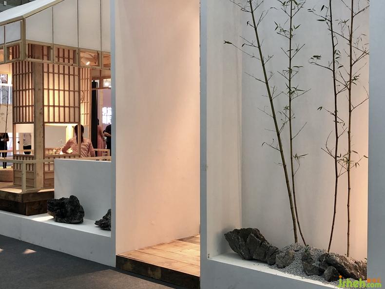 門庭雅潔,設計師在展位主次通道上皆設門庭入口,以修竹和逸石修飾。主入口處條石鋪陳連結(jié)老木板抬高的過道,過道上的漏窗和轉(zhuǎn)身處的月洞門皆是園林框景,給人以東方清雅澹靜的的精神意趣。
