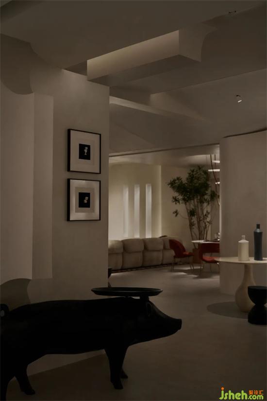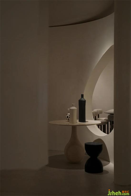 為了讓客人穿過前廳后能對后場區(qū)域繼續(xù)保持新鮮感,我們在Living和Art展廳區(qū)域交界處創(chuàng)作了一個裝置性的藝術通道,人們會被這個內建筑所吸引,具有吸引力的弧形墻體能讓展廳瞬間轉換空間情緒,神秘感油然而生,一步一步打開客人的好奇心,家居館設計后場濃郁的藝術氛圍會讓人心情愉悅,浪漫感油然而生。