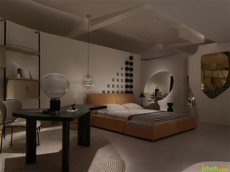 臥室空間靜謐而雅奢,磨砂質(zhì)感的床、黃古銅材質(zhì)的裝置掛鏡、家居館設(shè)計以及墻上帶有點中古味道的裝飾造型,給人的感覺這是一家很有文化素養(yǎng)以及內(nèi)涵的低調(diào)、質(zhì)樸、一些內(nèi)斂,圓鈍感更有包容性更加溫和更容易讓人接受。