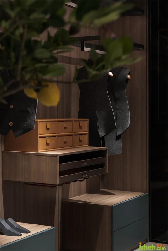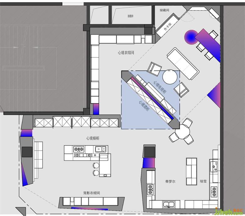 整個(gè)展廳可以分為5個(gè)區(qū)域,展廳設(shè)計(jì)以簡(jiǎn)潔的線條與切面,配合產(chǎn)品來(lái)傳達(dá)品牌理念,用擬家的布局來(lái)給顧客更好的體驗(yàn)感。展廳位置位于動(dòng)線交匯處,客流量較大,這是一個(gè)優(yōu)勢(shì),同樣也造就了項(xiàng)目空間在整個(gè)建筑空間里呈一個(gè)近于45°的斜角。展廳設(shè)計(jì)這也給我們?cè)诤罄m(xù)的設(shè)計(jì)中注入了一個(gè)45°的靈感。