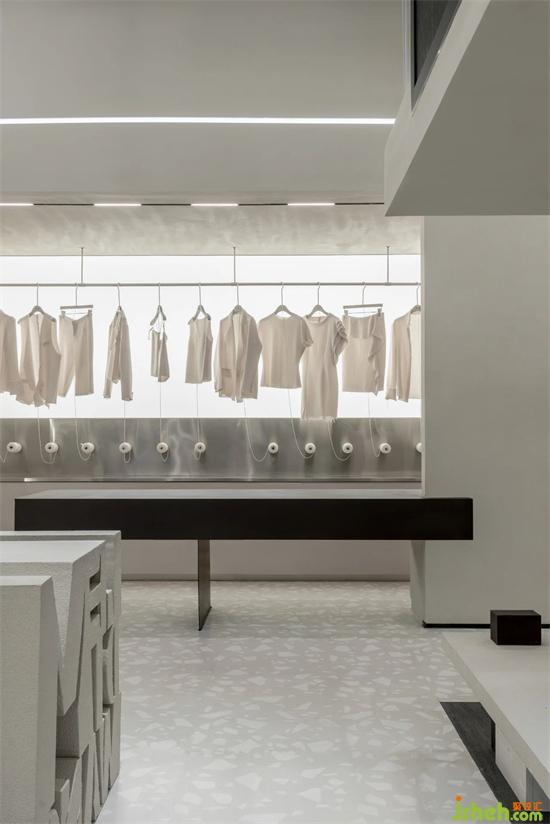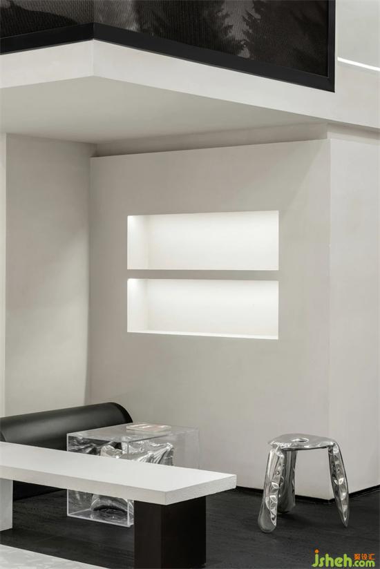 LEDIM WANG除了提供成衣以外,全系列產(chǎn)品也提供尺寸、顏色、面料的個性化定制服務(wù)。旗艦店設(shè)計因此設(shè)計團隊將前臺接待區(qū)與定制服務(wù)區(qū),兩個功能區(qū)整合,用框景的手法,結(jié)合背面的定制成衣展示空間,打造出有層次感的復(fù)合功能空間。