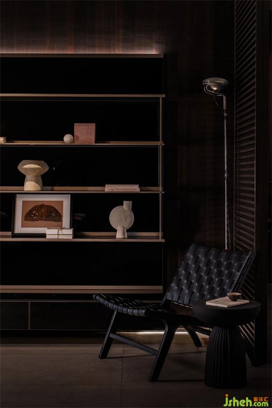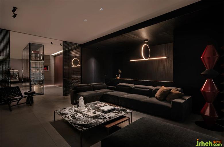 整個(gè)展廳歸納為6個(gè)空間。以簡潔直白的線條,空靈的的布局,傳達(dá)品牌理念、展示產(chǎn)品工藝。前廳為一個(gè)全開敞空間, 是展廳的入口和品牌展示界面。門展示區(qū)是進(jìn)入展廳的第一個(gè)展示空間,對(duì)景墻左側(cè),是陣列成一排的厘羋門,風(fēng)格色彩統(tǒng)一,潤舍納圖構(gòu)成了空間的序列感。與之連通的是衣柜展示區(qū),半透明的玻璃柜體,形成了空間朦朧的界線,自然的將人流引導(dǎo)到下一個(gè)空間??蛷d,兼具產(chǎn)品展示和接待功能,厘羋低調(diào)的LOGO墻前,是水吧區(qū),增加了空間的生活氛圍感,寬敞的意式沙發(fā),質(zhì)感的單椅,營造出舒適卻不失精致的家居體驗(yàn)。衣帽間對(duì)稱的布局方式,讓更衣這件事,變得更有儀式感。與之相對(duì)的是辦公區(qū)和選材間,用一扇半透材質(zhì)的推拉門作為隔斷,在工作的同時(shí),可以留意到店的客人。