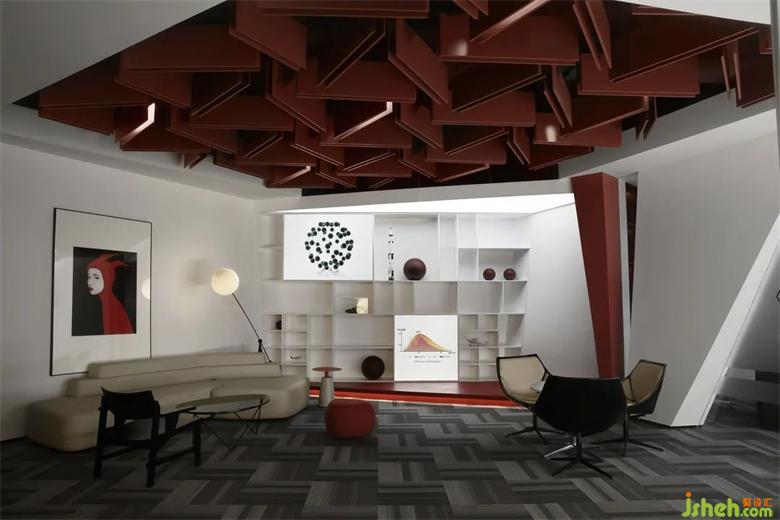 空間之上設(shè)計(jì)之始,如何將空間賦能與品牌價(jià)值,是整個(gè)空間設(shè)計(jì)一以貫之的策略及思考。空間初始,辦公位于商場(chǎng)一個(gè)轉(zhuǎn)角處,從視覺導(dǎo)向和品牌展示都缺少必要的空間延展性。辦公設(shè)計(jì)以幾何切面的設(shè)計(jì)啟發(fā),來(lái)源于品牌原始的產(chǎn)品屬性——石墨烯原子結(jié)構(gòu)(由碳原子 以sp2雜化軌道組成以蜂巢狀晶格的六邊型形態(tài)),因此空間上以原子結(jié)構(gòu)作設(shè)計(jì)靈感,熱烈的紅色貫穿整個(gè)空間作視覺引導(dǎo),有機(jī)的將品牌屬性植入于空間體系。