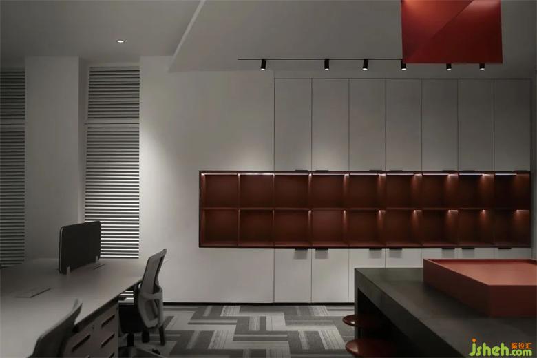 辦公區(qū)域,由自由切面包裹所形成的內(nèi)部空間,空間自由通透同時又機具張力,辦公設(shè)計讓原本呆板的轉(zhuǎn)角空間,得以很好的視覺延展。簡潔開放的辦公區(qū)域,頂上多邊形構(gòu)架,以及墻面收納柜體,整體而統(tǒng)一很好的呼應(yīng)空間主體的設(shè)計語言。