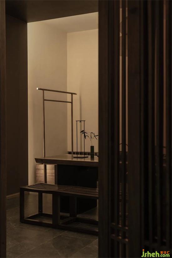 古建筑常見有時(shí)間肌理的“白墻”、老木門等原始元素用現(xiàn)代嶄新的材料呈現(xiàn),在與木格柵、青石板圍繞的同一空間中巧妙的形成一種差異化美感,茶樓設(shè)計(jì)極大的提升了接待的體驗(yàn)以及空間張力。