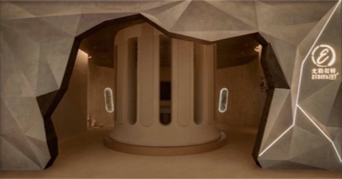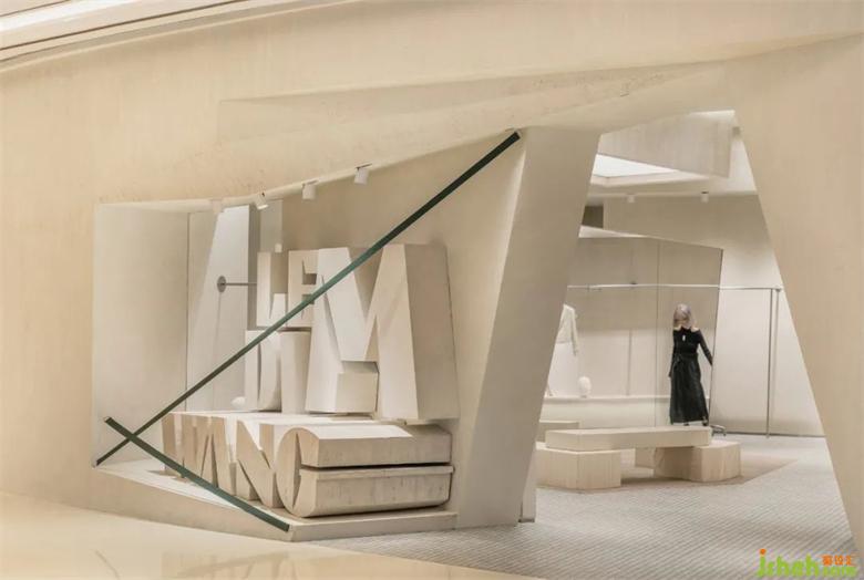 設(shè)計團(tuán)隊用硬朗的線條和利落的剪裁,將空間進(jìn)行立體切分,用折疊法打開立面入口,用內(nèi)建筑體塊打破室內(nèi)格局,并將其旋轉(zhuǎn)、抽拉,形成回字交通動線,在行走中轉(zhuǎn)折間創(chuàng)造游園驚夢的情緒感受。