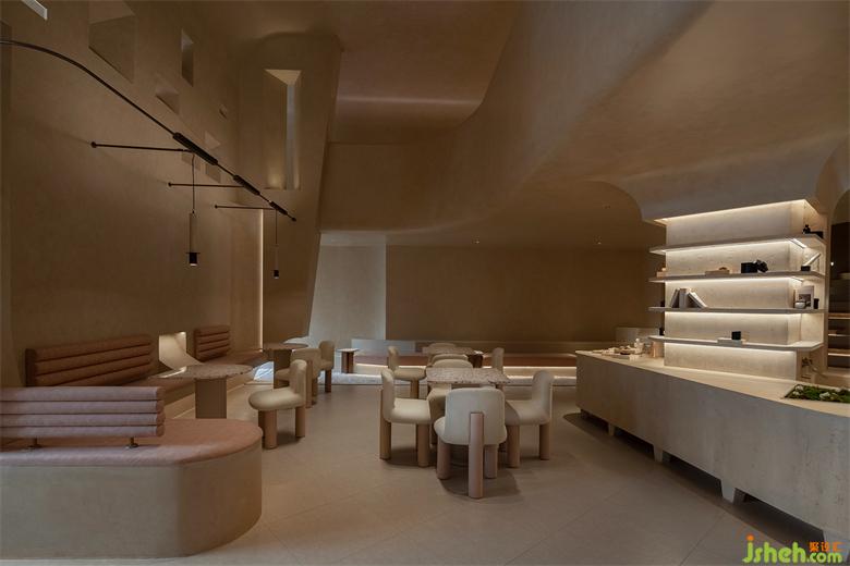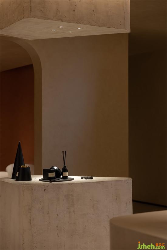 會(huì)所設(shè)計(jì)利用那些保留著古老悠長(zhǎng)之夢(mèng)的空間結(jié)構(gòu)引起人們的共鳴,從新古典主義借鑒過(guò)來(lái)的熟悉感,構(gòu)建并召喚集體回憶,在被抽象的歷史印象所充斥的環(huán)境中,當(dāng)代生活的轉(zhuǎn)瞬即逝被消解,會(huì)所設(shè)計(jì)與羅馬柱呼應(yīng)的是更有巖石形態(tài)與質(zhì)感的幾何體塊,直立的、傾斜的,穿插在空間中與弧面相接,內(nèi)嵌的"石龕"中陳放著手工敲打的鐵盒香薰與書(shū)卷,述說(shuō)著一段秘史。