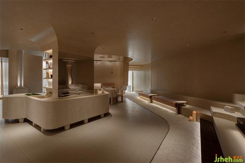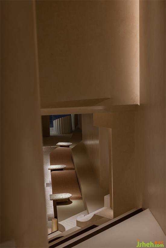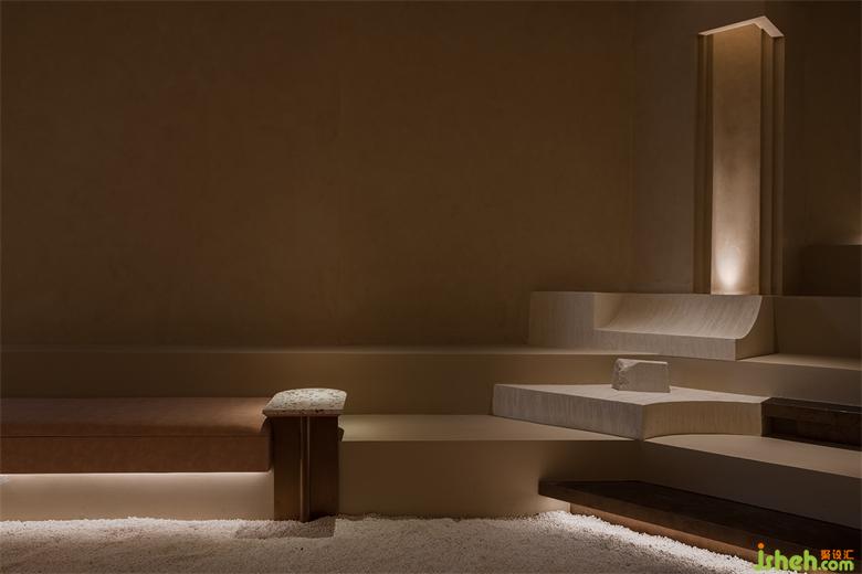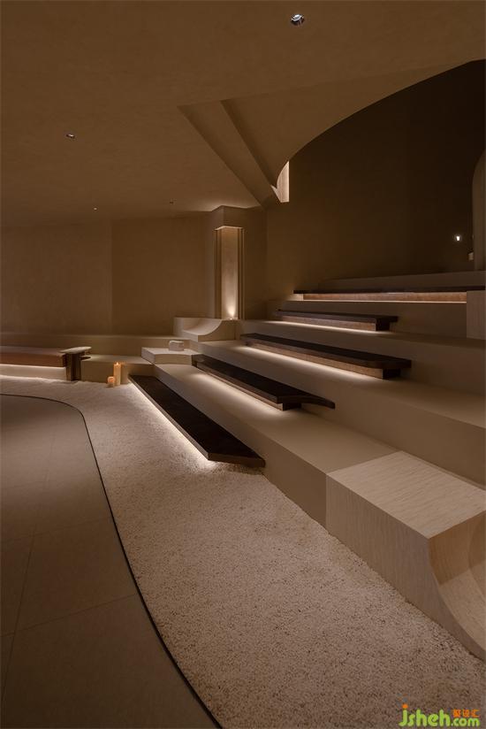 用“倫布朗光”的明暗對(duì)比方式勾勒空間形態(tài),在光影中重塑細(xì)膩、斑駁、顆粒狀與拋光材質(zhì)的沖突與交織般的戲劇效果。會(huì)所設(shè)計(jì)由微水泥與仿古銅不銹鋼拼接組成的臺(tái)階,燈帶隱藏在間隙,自下而上的燈光既在空間里描摹出多樣的層次,也能帶給拾級(jí)而下的人奇妙的秀場(chǎng)體驗(yàn)。