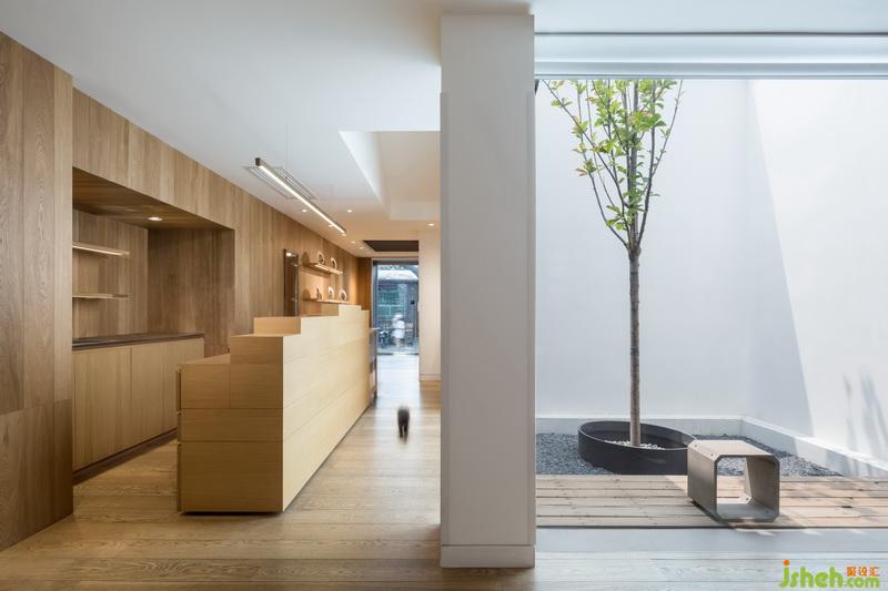 再往前走,收銀吧臺(tái)正對(duì)著這處空間中最宜人的庭院。一整面的玻璃墻不僅將自然光悉數(shù)灑進(jìn)室內(nèi),更是將庭院中的綠景引入了室內(nèi)。行至此處,來人皆會(huì)放慢腳步。