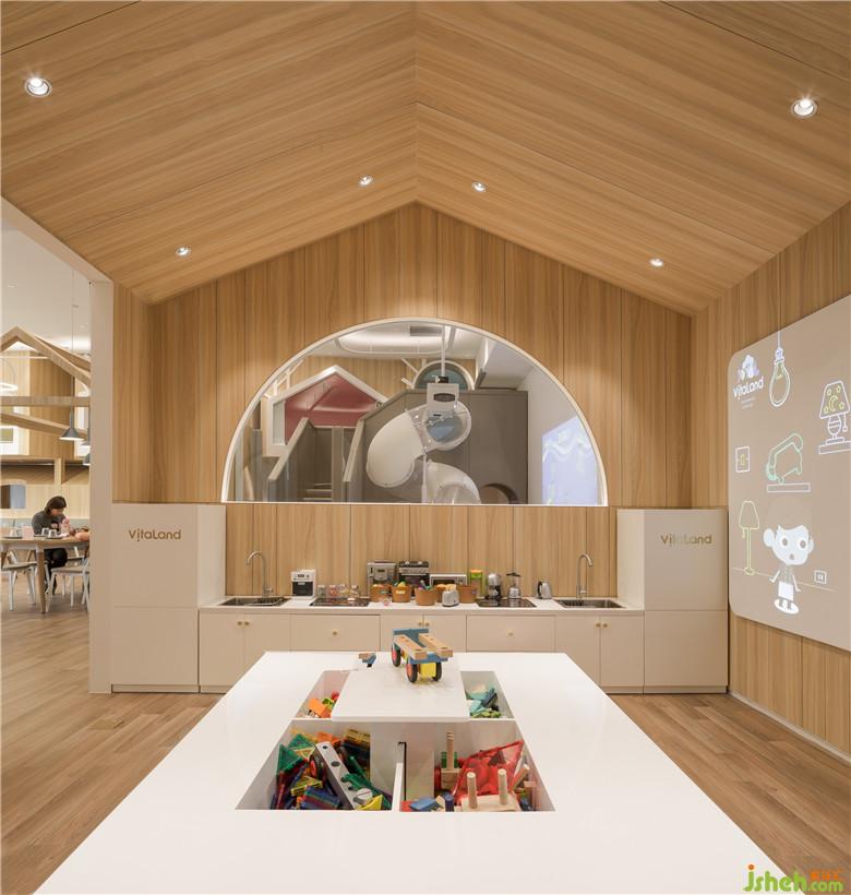 而餐區(qū)的右邊,以框架構(gòu)筑的小屋為界限,分隔了餐區(qū)域兒童體驗(yàn)的區(qū)域,各種不同場景的體驗(yàn)活動,令成年人也羨慕不已。