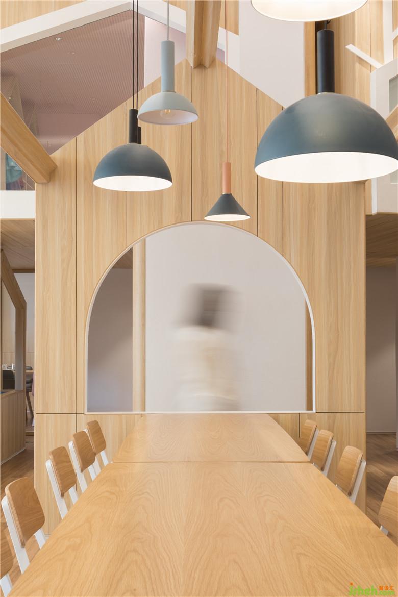 大廳的盡頭便是整個(gè)空間最最有趣的樹(shù)屋聚落。層錯(cuò)的小屋彩色的玻璃窗,玻璃的顏色不僅來(lái)區(qū)分空間又與視覺(jué)系統(tǒng)相呼應(yīng)。下層的小屋是包廂、兒童的休息室。而樓上層高不足1.5米的空間被設(shè)計(jì)成為又一不同主題的兒童體驗(yàn)空間,這個(gè)層高對(duì)于成年人而言需要彎腰才能進(jìn)入,但是對(duì)于孩子而言卻是恰恰合適而又充滿(mǎn)安全感。