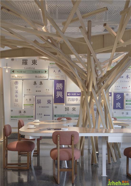 吧臺前面是由老式對象和郁郁蔥蔥的綠植組成的等候區(qū)。老式車站的座椅、懸掛的時鐘、鐵路旁的標識、信號燈、紅綠燈、小攤車上的雜貨等等,給那一坐,就像是走到了站臺上,馬上幾分鐘列車就要進站了。再往前方一看,一棵穿天大樹后面,有一整面錯落有致的站牌標,集合了臺灣知名的車站名還有不同式樣的車站標識。讓人不由得想起昔日的暖暖人流如織,茶葉、煤礦都在此轉(zhuǎn)運,不過隨著時間的推移而逐漸沒落,只有那些大樹陪伴在左右。樹下是一個大大共享餐桌,將就餐的客人帶回人流如織的暖暖車站,體會那時美好溫暖的氛圍。