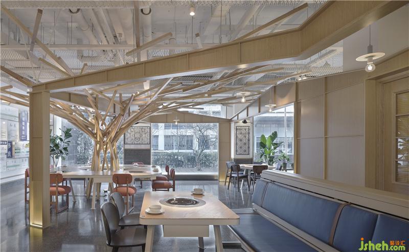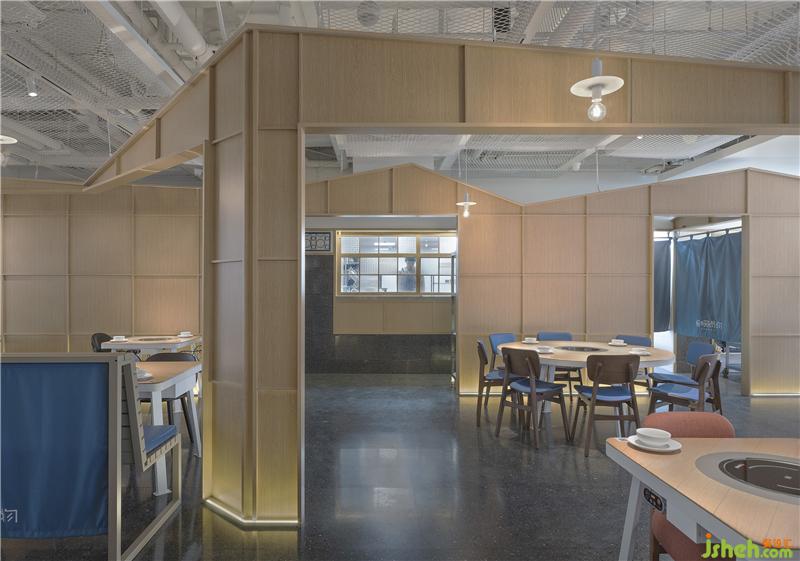 抬頭看,空間里來自臺灣火車站的山墻造型有升有落,遠近相映,貫穿整個空間。它時而平行時而彎曲,層層疊疊錯落的山墻仿佛是跳躍的音符,當它亮起來的時候就是暖暖的歌。它串起暖暖的天空,為客人遮擋風雨,帶來溫暖之意。設(shè)計師想借助山墻這一語言,帶客人穿梭回舊時代的古早味,感受那時臺灣的風土人情。在功能用途上可穩(wěn)定整體空間視覺,且為空間做區(qū)分,中心區(qū)域山墻起隔斷作用圍合形成包間,環(huán)繞包間區(qū)域成為外場。暖暖鍋物營造的氛圍不似一般火鍋店擁擠喧囂,而是憩息與安寧,讓人想坐在窗邊靜靜品一杯正宗臺灣茶飲,小憩片刻。