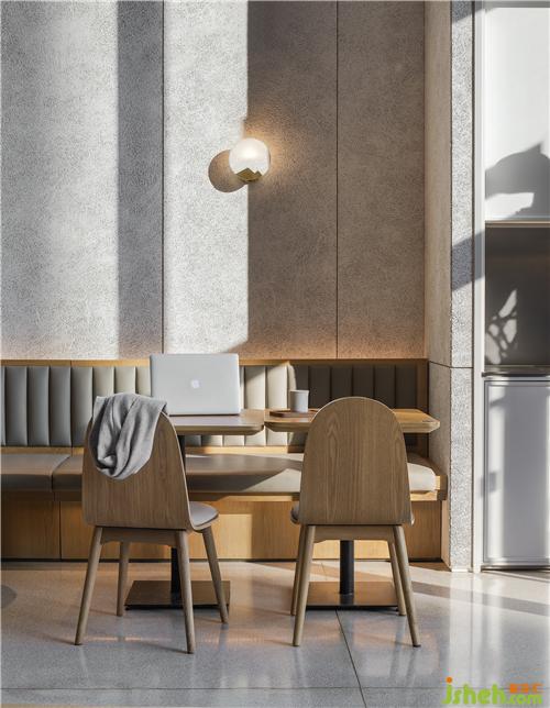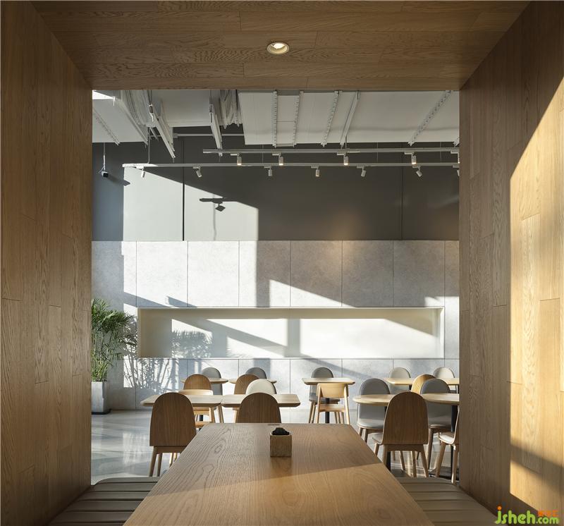 空間以白色與木色為主,自然簡潔,材質(zhì)上采用橡木地板與白色木色板為主要材質(zhì),墻面上大面積使用的白色木絲板材質(zhì)有效降低與其他區(qū)域的相互干擾,實現(xiàn)完美的聲學(xué)效果??Х葟d設(shè)計