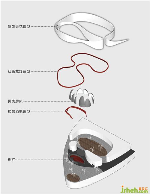 中部的旋轉(zhuǎn)樓梯分隔了餐廳南北兩區(qū),如果僅僅將它作為一個(gè)通道口未免太浪費(fèi),于是設(shè)計(jì)團(tuán)隊(duì)在保留了旋轉(zhuǎn)樓梯原有的扶手石材的基礎(chǔ)上,依附著樓梯扶手石材形態(tài)利用紅色人造石做成了一個(gè)具功能性的酒吧臺(tái),酒吧飄帶的形式亦呼應(yīng)了空間整體概念。