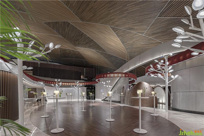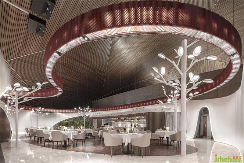餐廳的照明則采用了樹的形態(tài),樹象征著生命力,樹燈無序地穿插在餐廳各處,解決了無吊頂?shù)恼彰鲉栴}的同時(shí),也給空間注入了新生的寓意。配合飄帶立面造型,營(yíng)造了藝術(shù)叢林的空間氛圍。