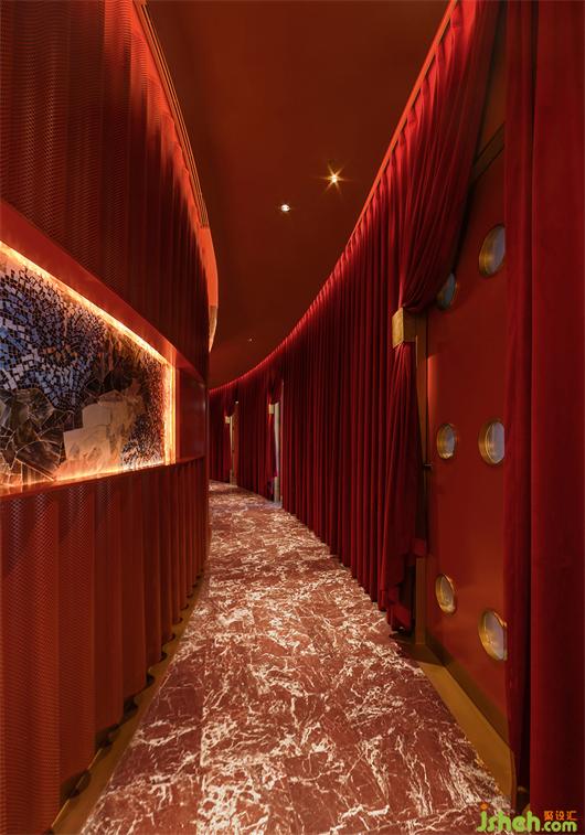 幕布將空間分為兩個(gè)區(qū)域:就餐區(qū)與廚房功能區(qū)域,就餐賓客如同置身于一出大戲之內(nèi),讓傳統(tǒng)戲曲與火鍋在粵界“跨界融合”,碰撞出新中式的文化沉浸餐飲體驗(yàn)。
