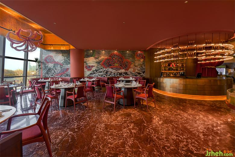 大廳落地窗作為空間視覺(jué)的中心,描繪山巒河海的大線條色塊與明快裝飾性強(qiáng)的植物裝飾紋樣相結(jié)合,餐飲設(shè)計(jì)采用浮世繪的構(gòu)圖邏輯和馬賽克拼貼工藝,環(huán)繞在櫥窗、大廳墻面與海鮮缸等重要視覺(jué)節(jié)點(diǎn)。