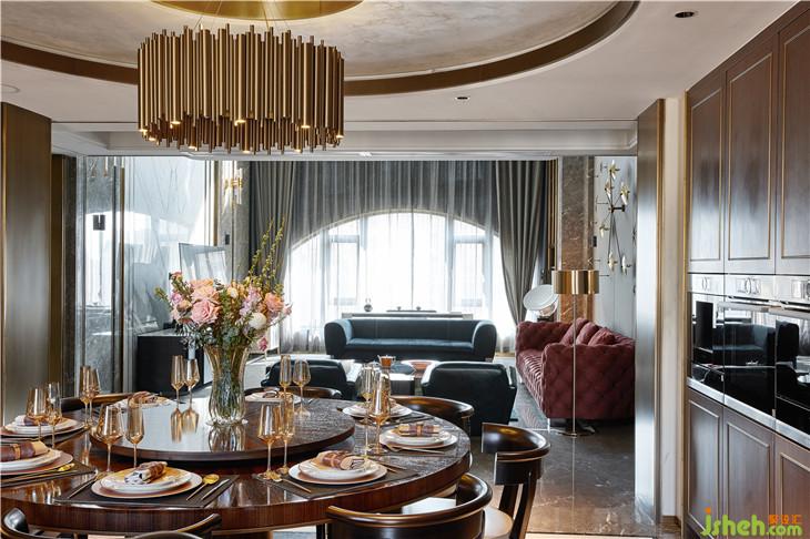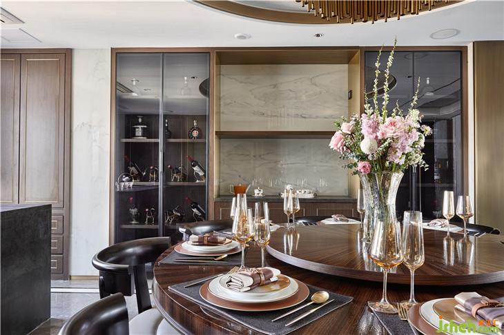 抬頭金屬吊燈的設(shè)計,增強(qiáng)了空間的層次,讓整個空間立體起來。造型簡潔優(yōu)雅、木質(zhì)珍貴的promemoria的餐桌,搭配金屬質(zhì)感、弧形設(shè)計的餐椅,讓空間增添符合現(xiàn)代人審美的時尚質(zhì)感,并與周圍硬裝的空間塑造相呼應(yīng),軟硬裝和諧融合,成功的營造出莊重高貴的空間氣質(zhì)。質(zhì)地精致的高腳杯等餐具和鮮花元素的植入,使用餐環(huán)境變得美麗優(yōu)雅,讓用餐氛圍多了一份浪漫怡人。