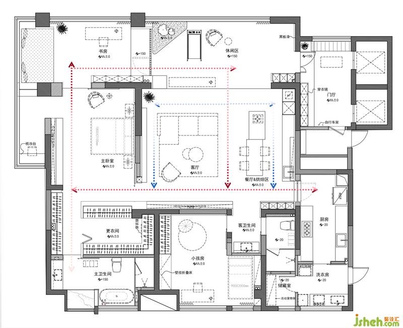 客廳/烘焙區(qū)/休閑區(qū)相結(jié)合組成公共區(qū)域,讓每個人在做自己事情的同時可以實現(xiàn)互動性。